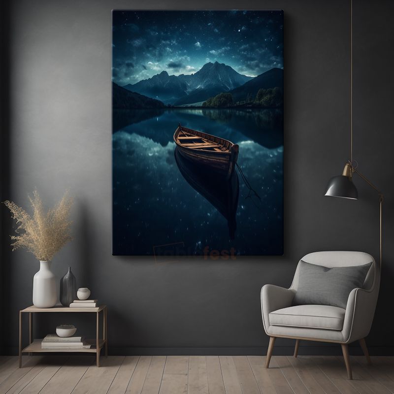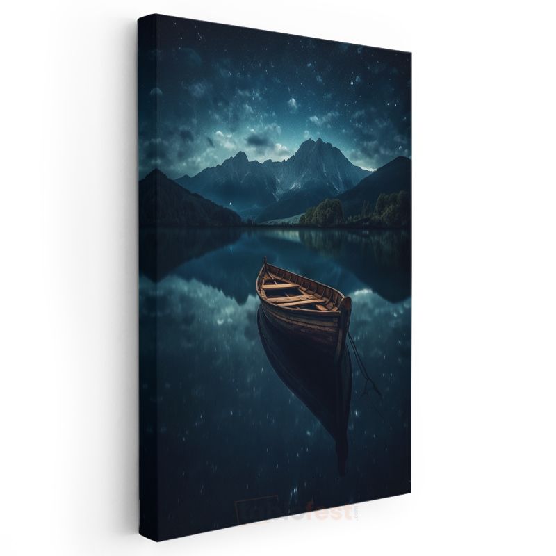Gece Gölü - Yıldızlar Altında Yalnız Tekne Kanvas Tablo