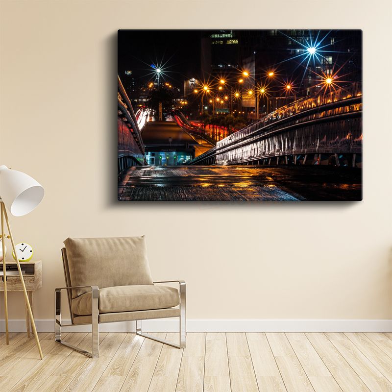 Gece Köprüsü - Işık Yıldızları ve Yansımalar Kanvas Tablo