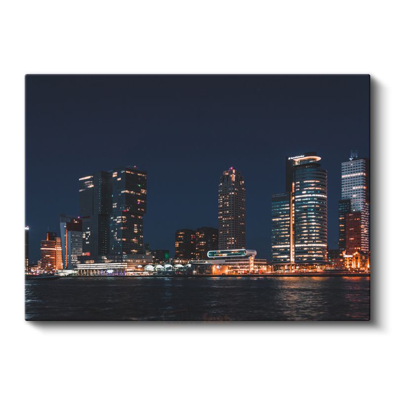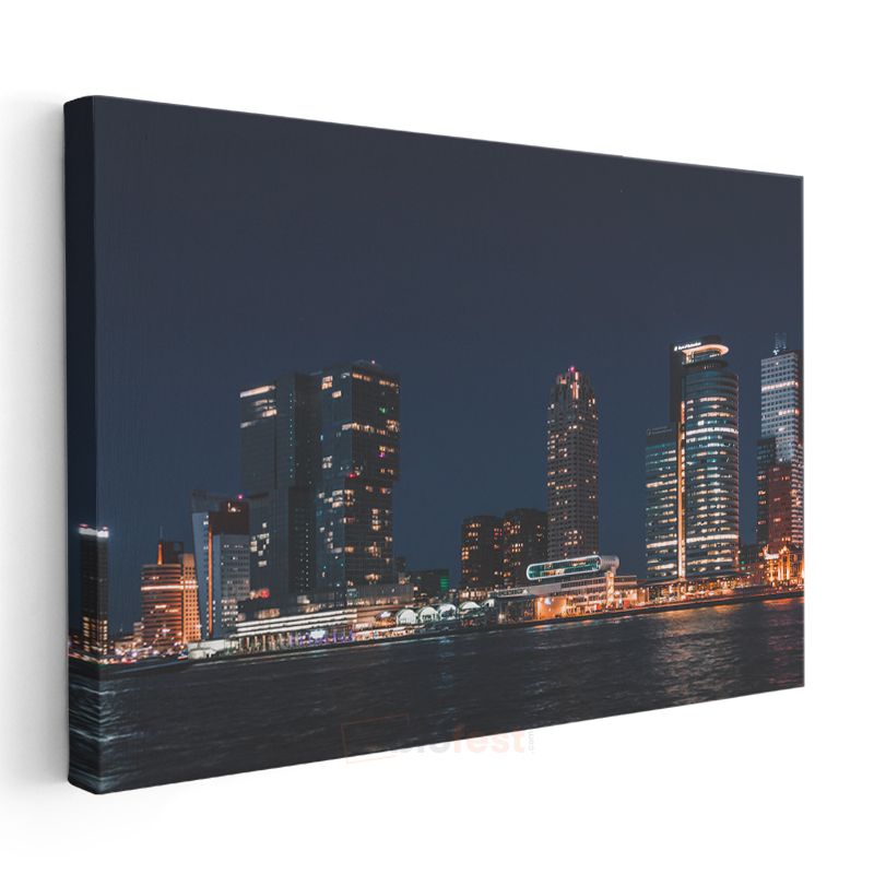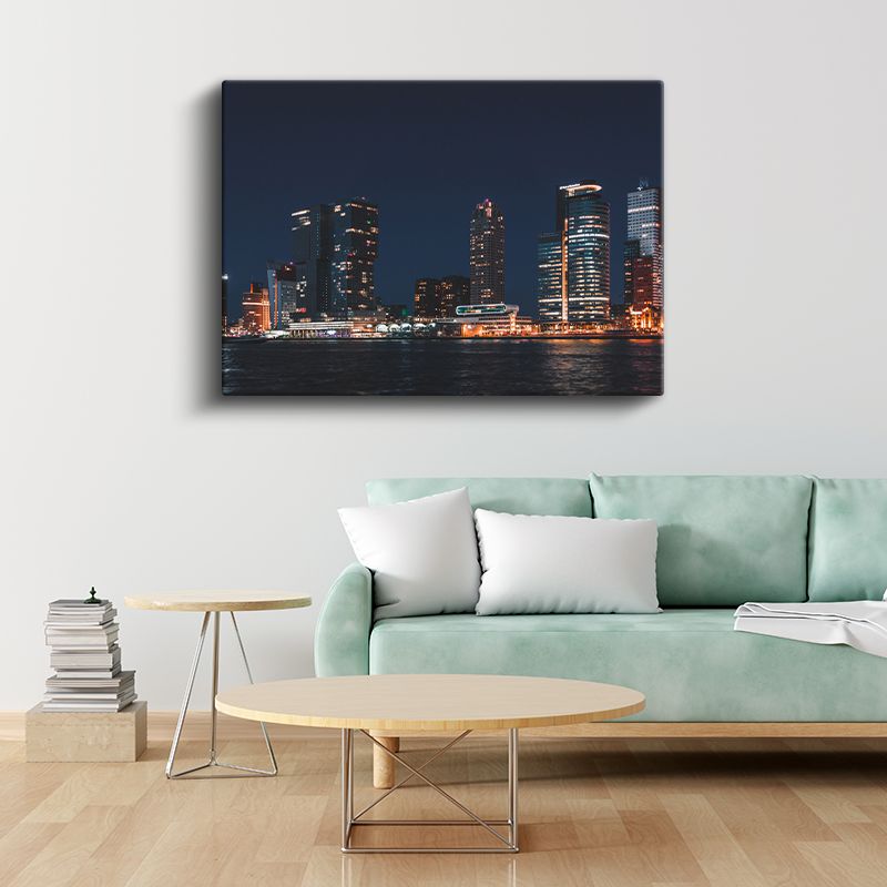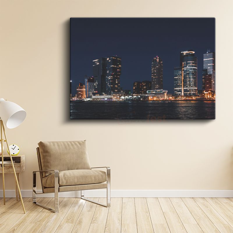 Gece Şehir Silueti - Su Kenarında Işıklı Gökdelenler Kanvas Tablo