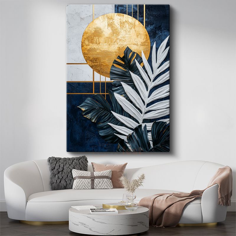 Geometrik Denge - Altın Ay ve Palmiye Yaprakları Kanvas Tablo