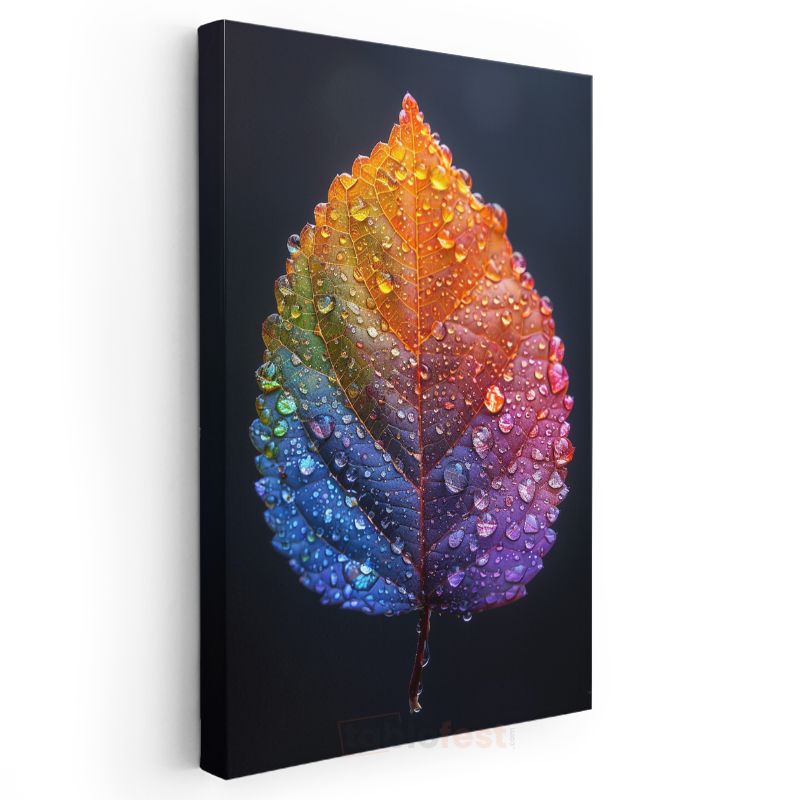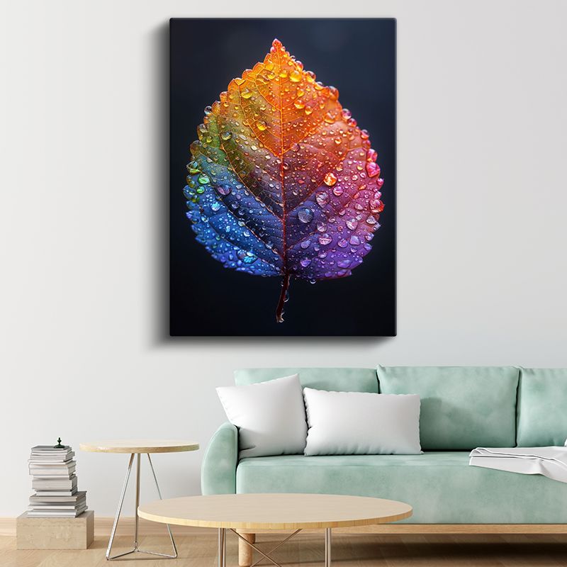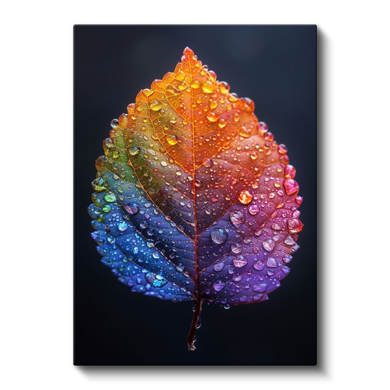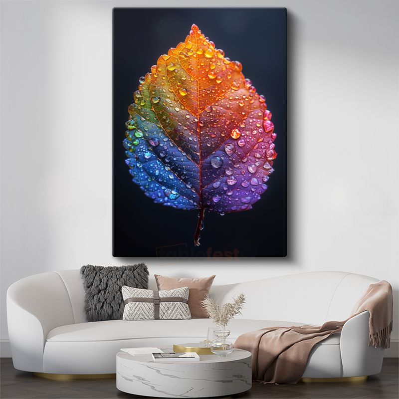 Gökkuşağı Yaprak - Çiy Damlalı Makro Doğa Kanvas Tablo