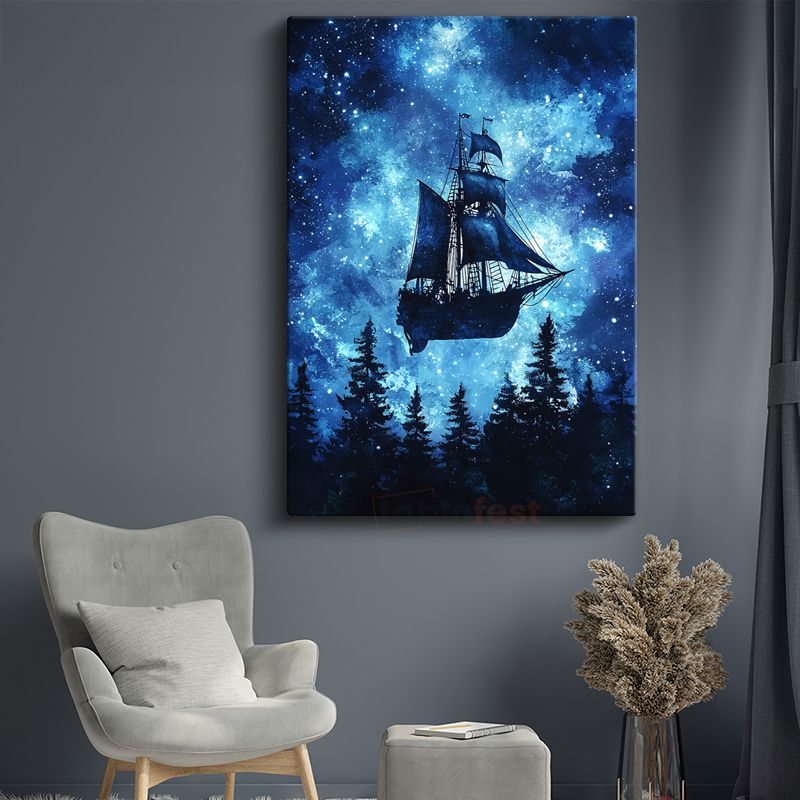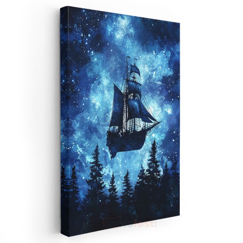 Göksel Gemi - Yıldızlar Arasında Süzülen Mistik Yelkenli Kanvas Tablo