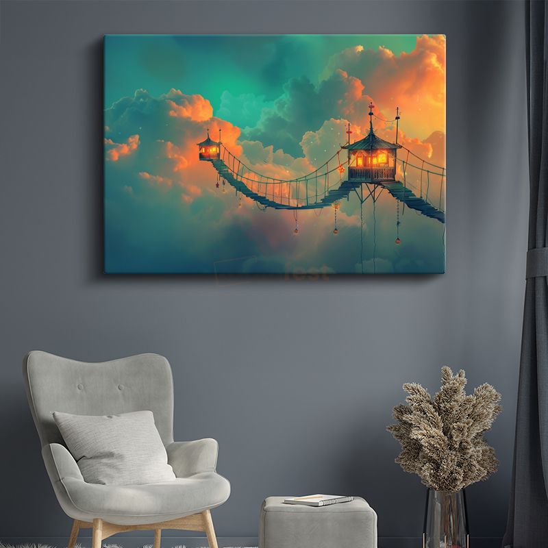 Gökyüzü Kulübeleri - Bulutlar Arasında Asılı Köprülü Evler Kanvas Tablo