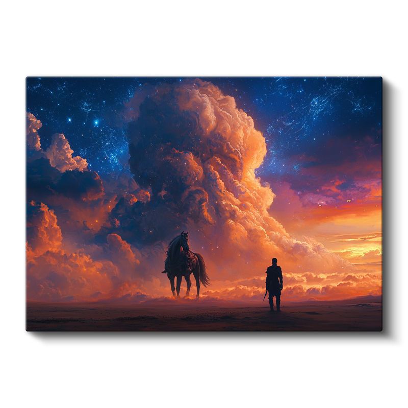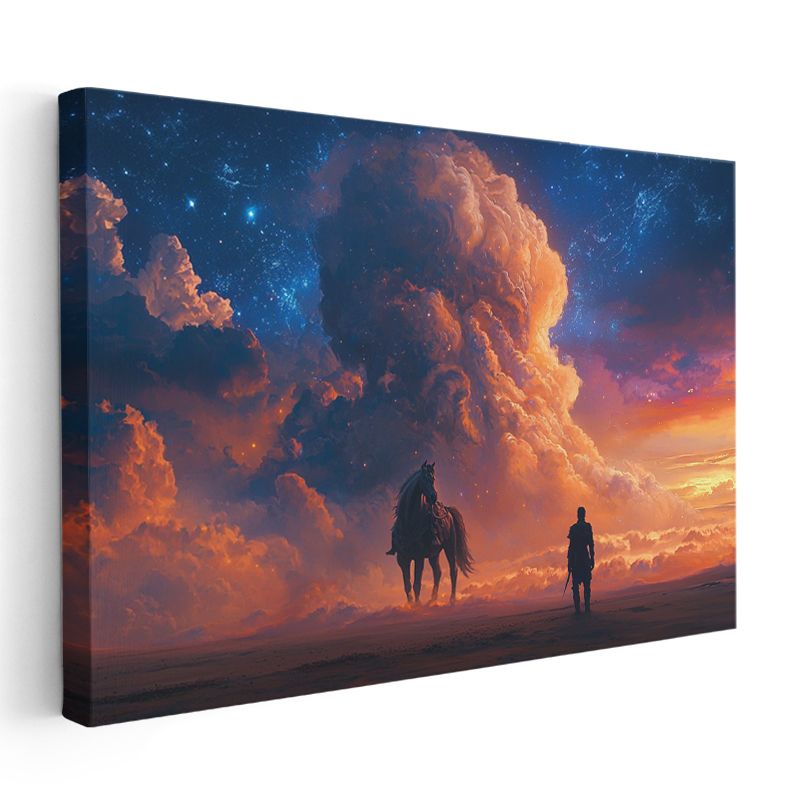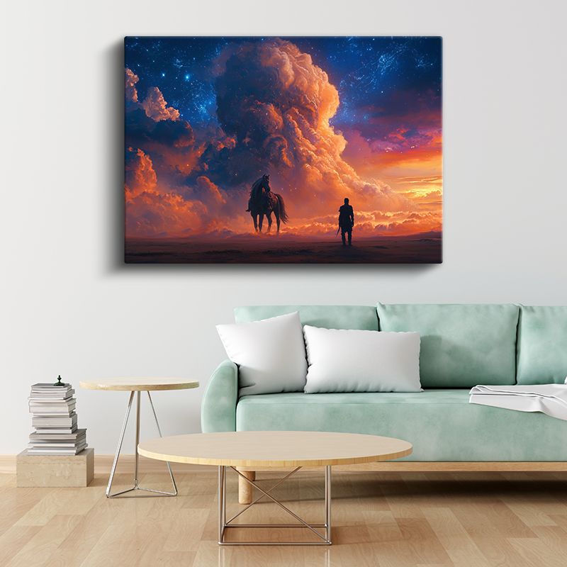 Gökyüzü Yolcuları - Alev Renkli Bulutlar Arasında At ve İnsan Silüeti Kanvas Tablo