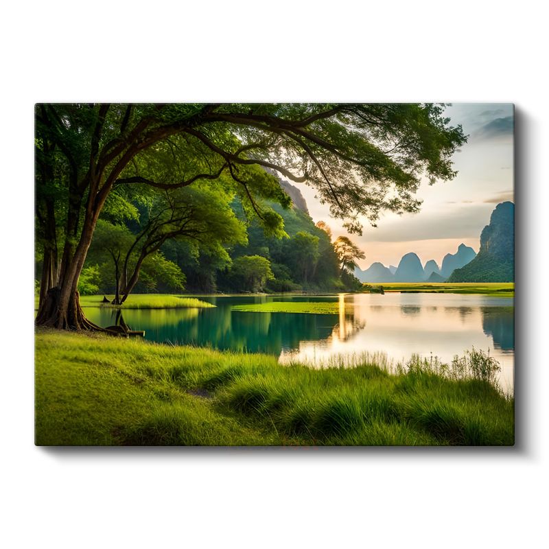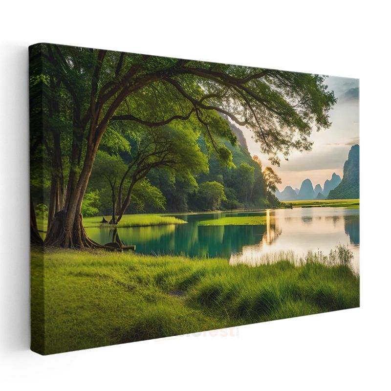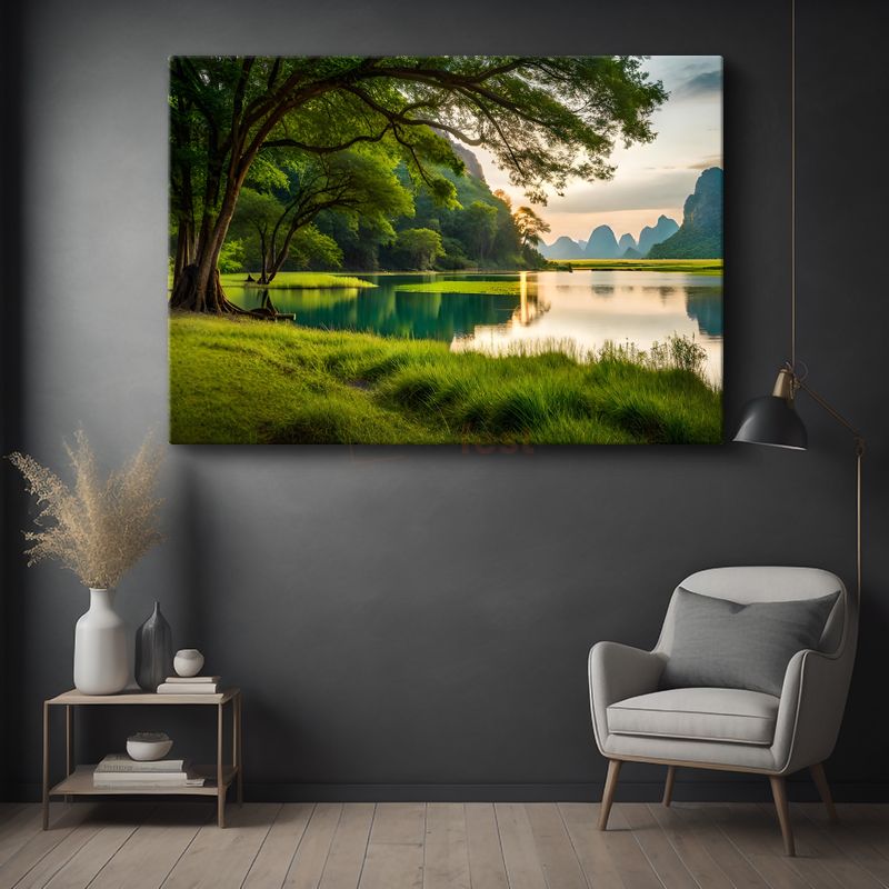 Göl Kenarı - Yeşil Doğa ve Dağ Silüeti Manzarası Kanvas Tablo
