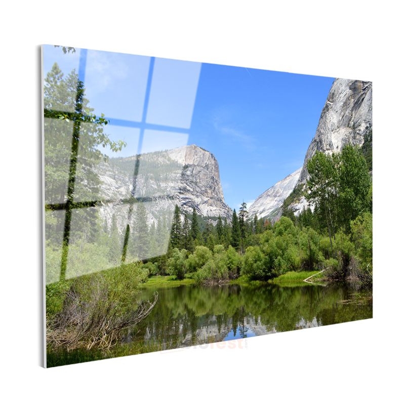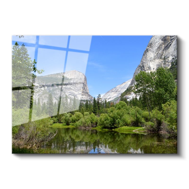 Granit Zirveler - Yeşil Vadide Sakin Göl Manzarası Cam Tablo