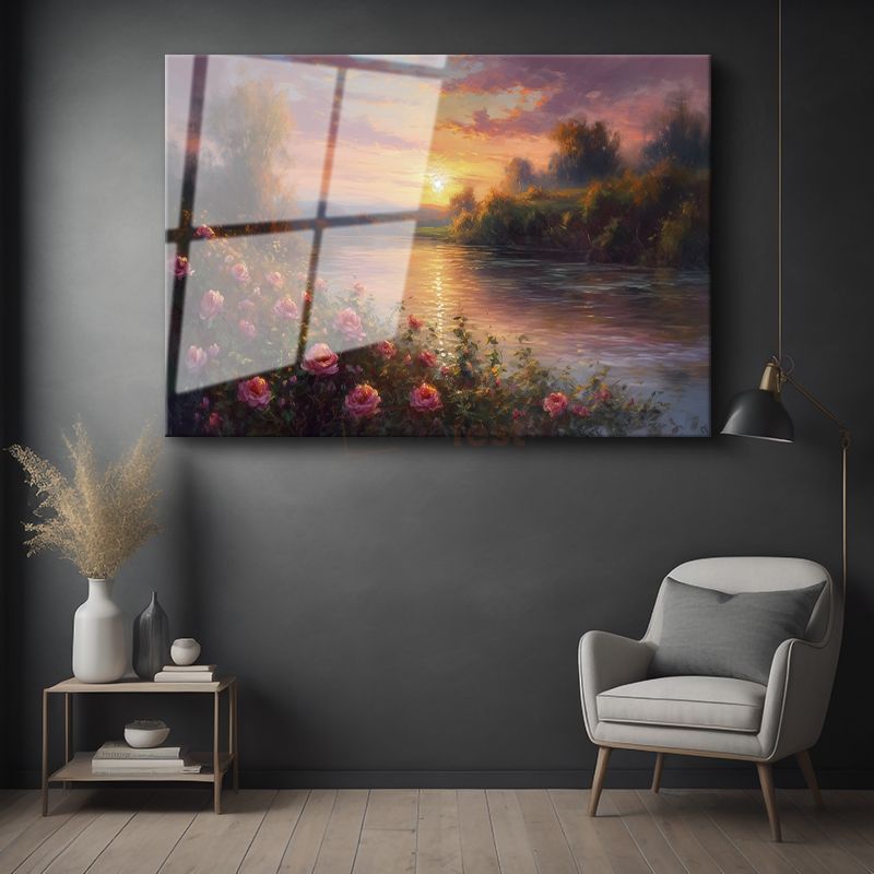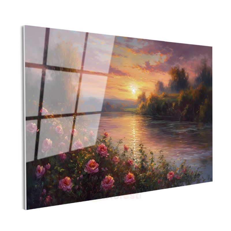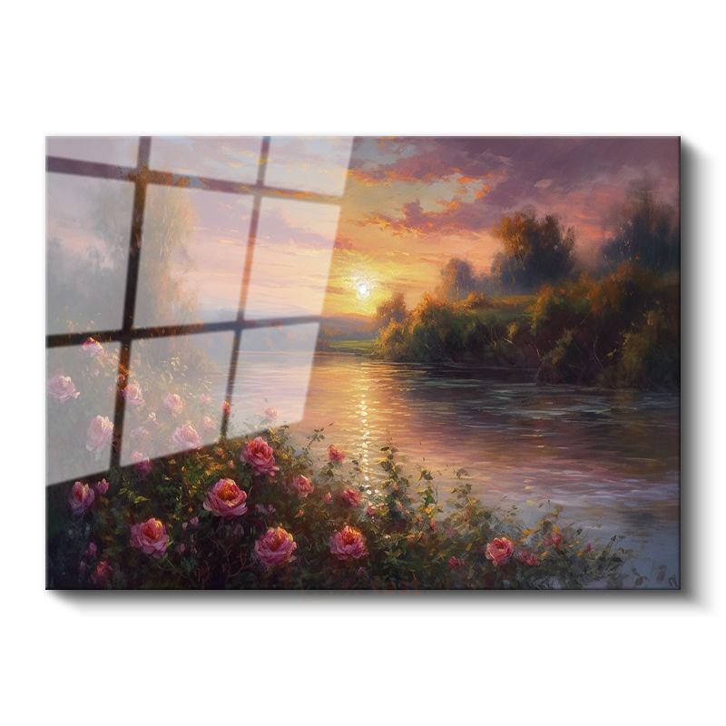 Gül Bahçesi - Altın Gün Batımında Nehir Kıyısı Cam Tablo