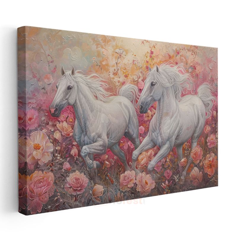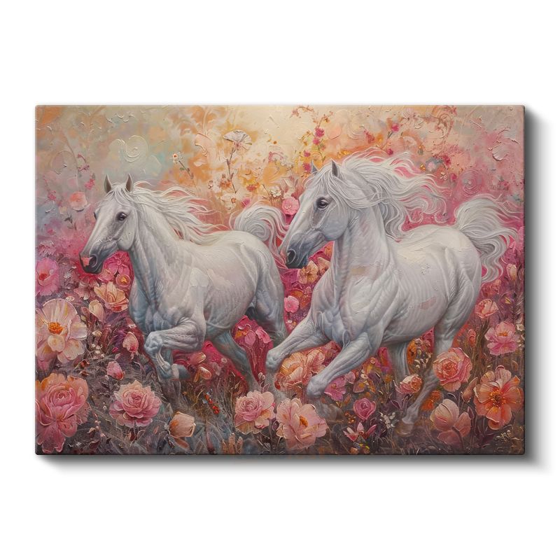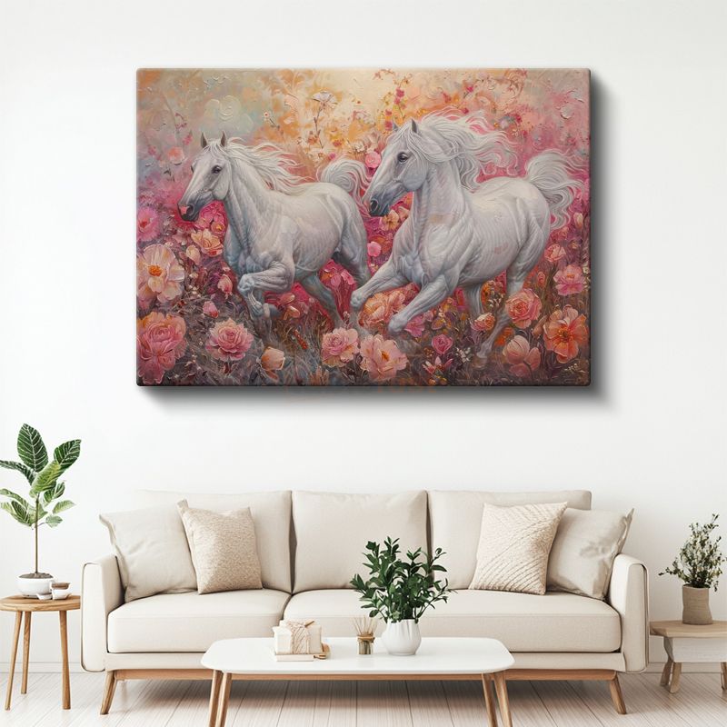 Gül Bahçesi - Çiçekler Arasında İlerleyen Beyaz Atlar Kanvas Tablo