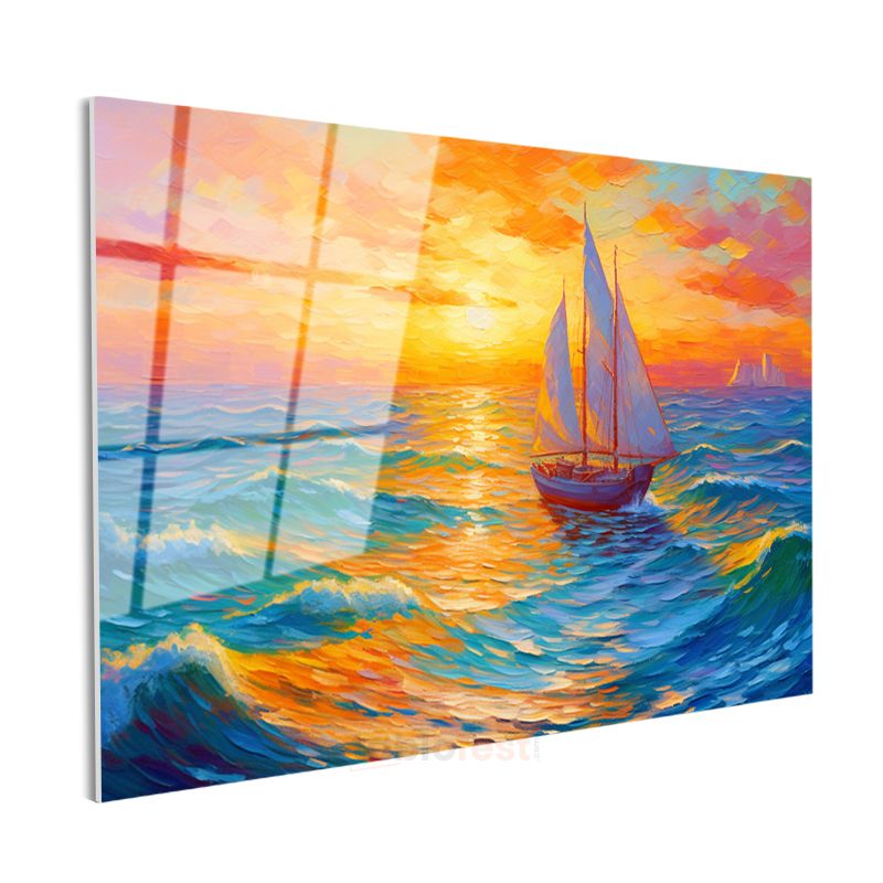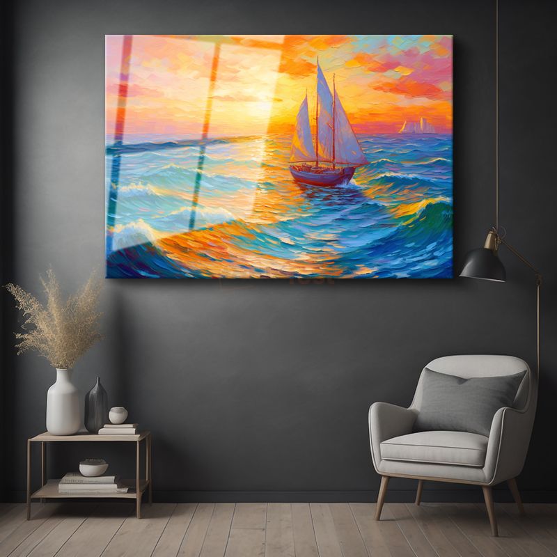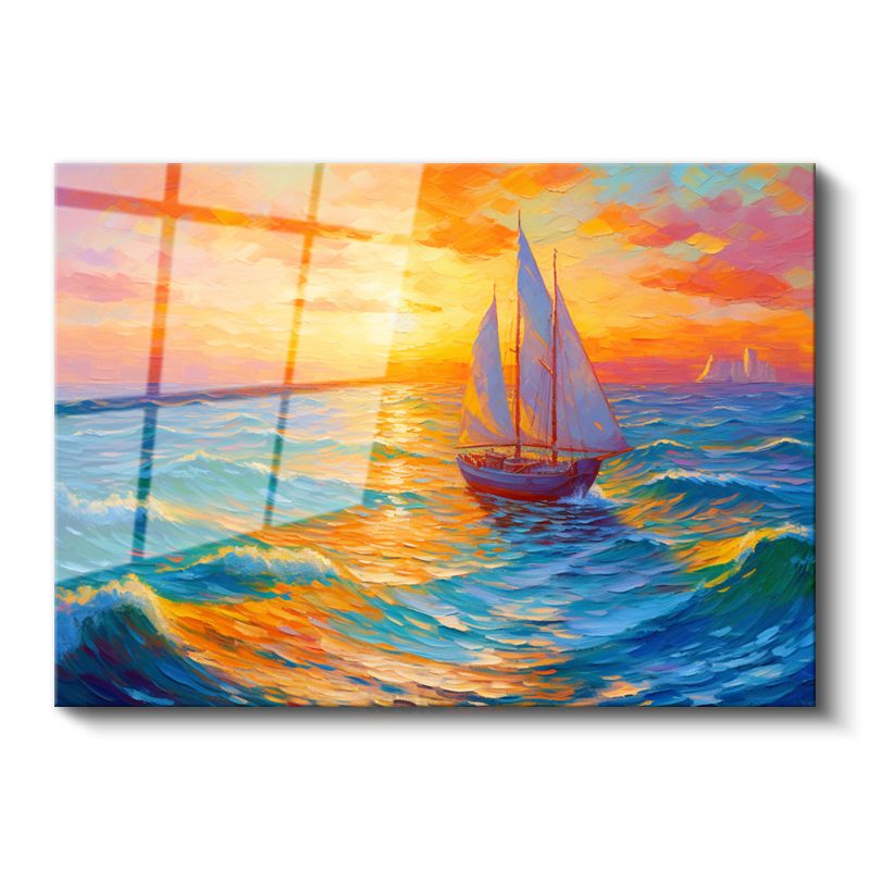 Gün Batımı - Dalgalı Denizde Yelkenli Cam Tablo