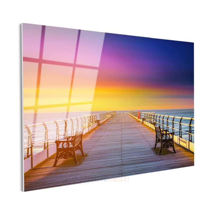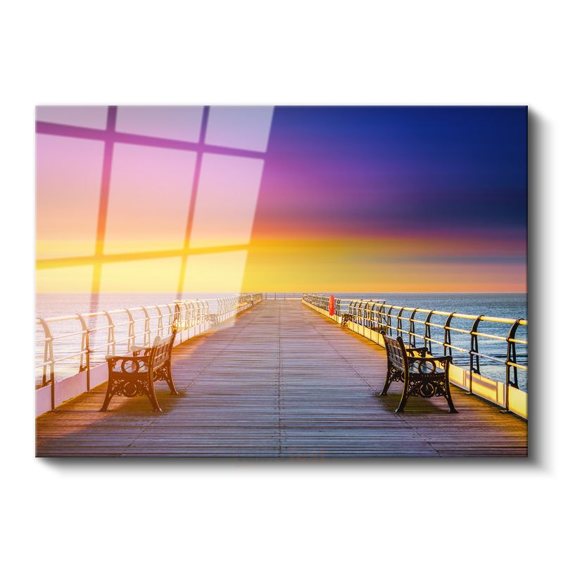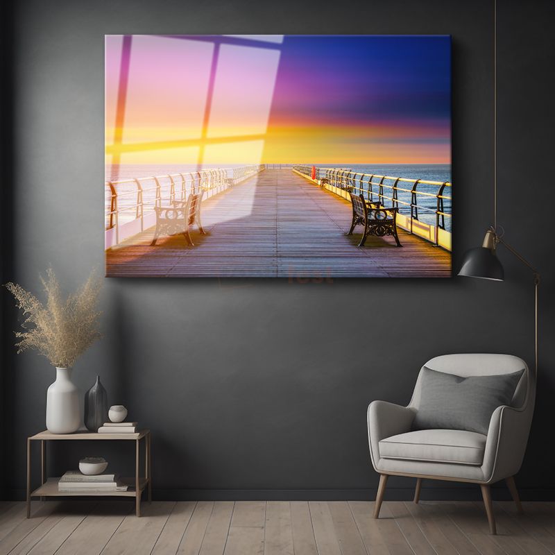 Gün Batımı İskelesi - Renkli Gökyüzü Altında Deniz Manzarası Cam Tablo