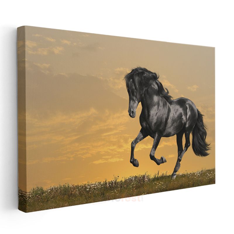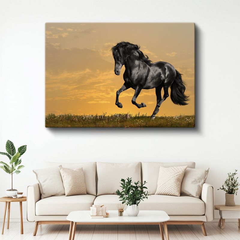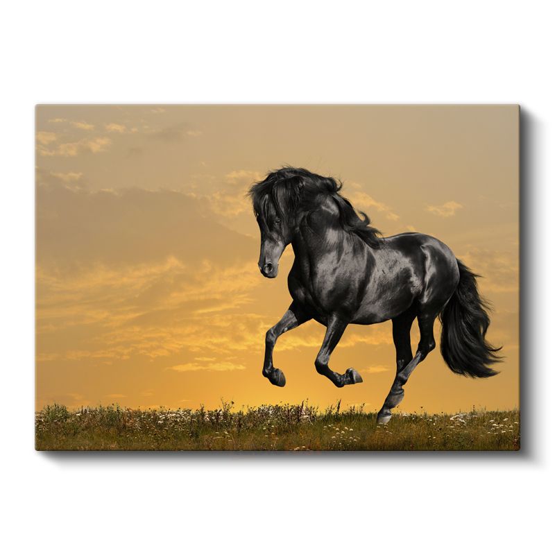 Gün Batımı Koşusu - Çayırdaki Siyah At Kanvas Tablo