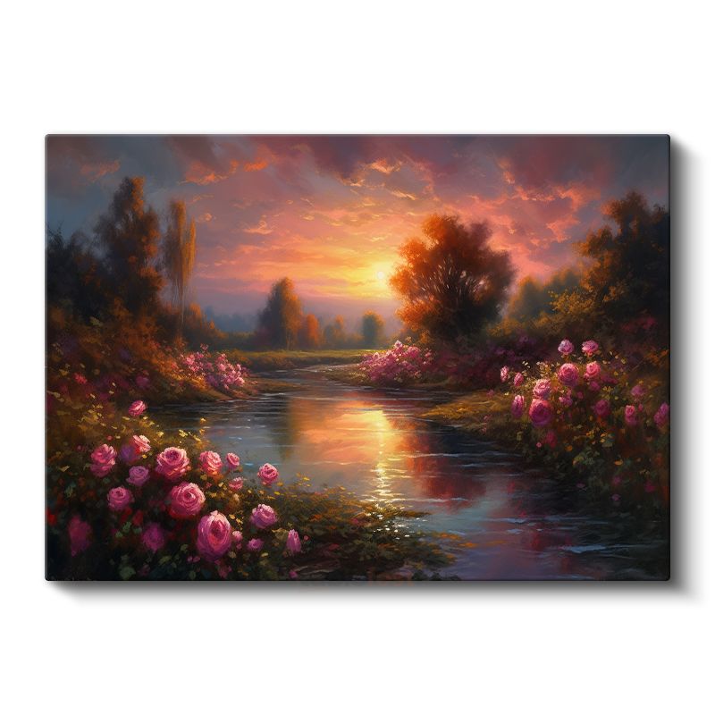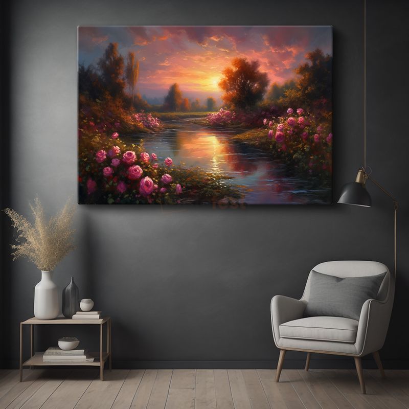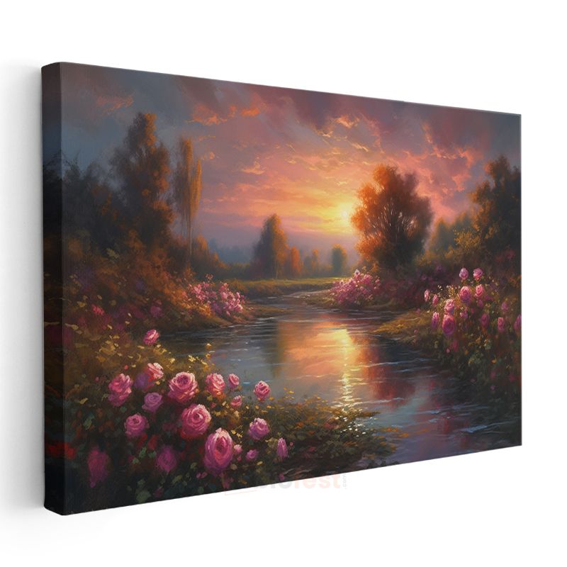 Gün Batımı - Pembe Güller ve Nehir Yansıması Kanvas Tablo