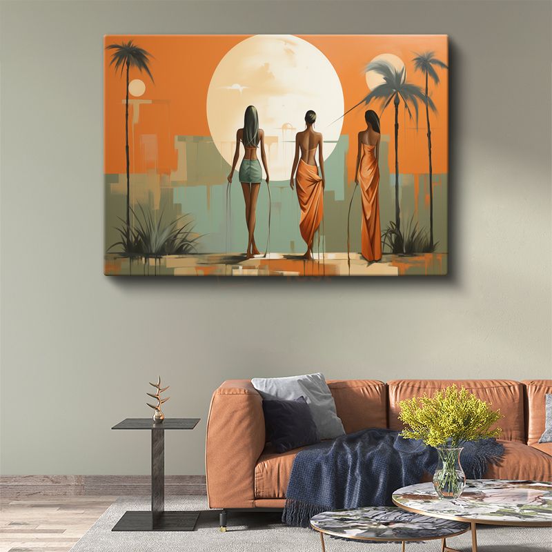 Gün Batımı Silüetler - Turuncu Yeşil Vektörel Kanvas Tablo