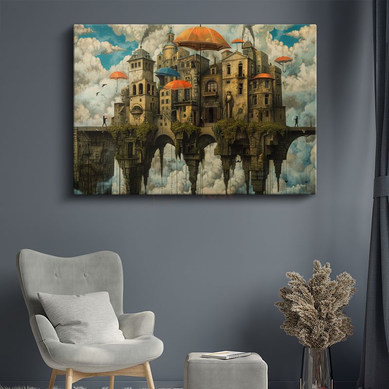 Havada Asılı Şehir - Şemsiyelerle Korunan Fantastik Mimari Kanvas Tablo