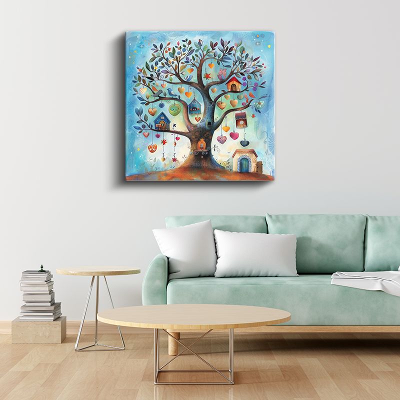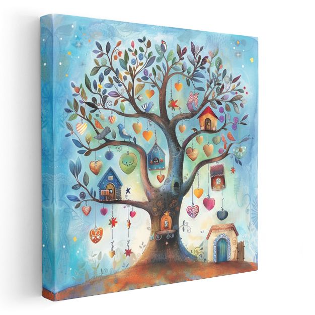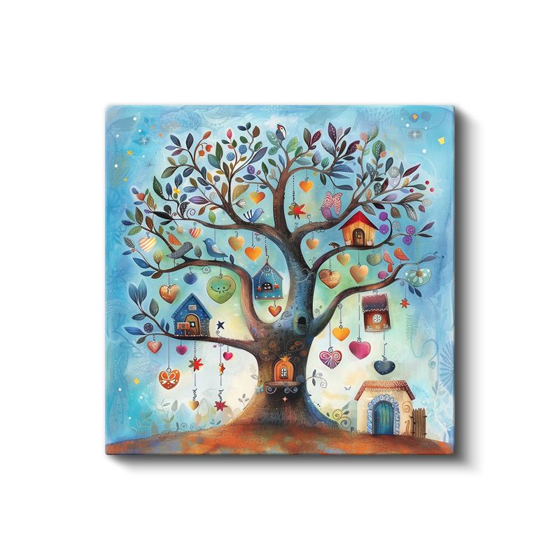 Hayal Ağacı - Renkli Kalpler ve Kuşlar Kanvas Tablo