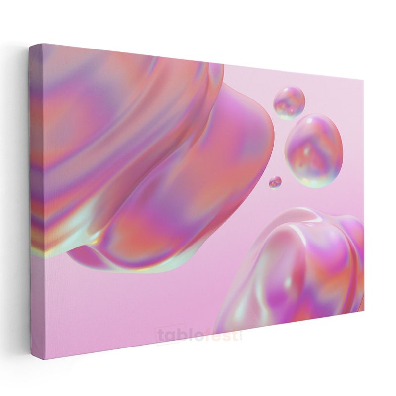 Holografik Küreler - Pembe Zeminde İridescent Kabarcıklar Kanvas Tablo