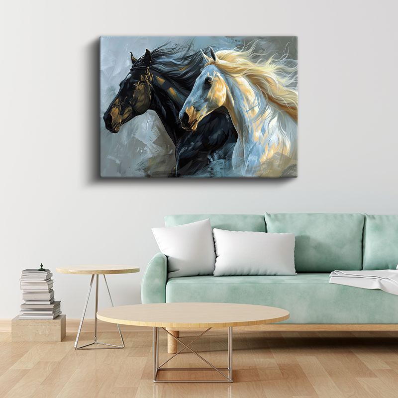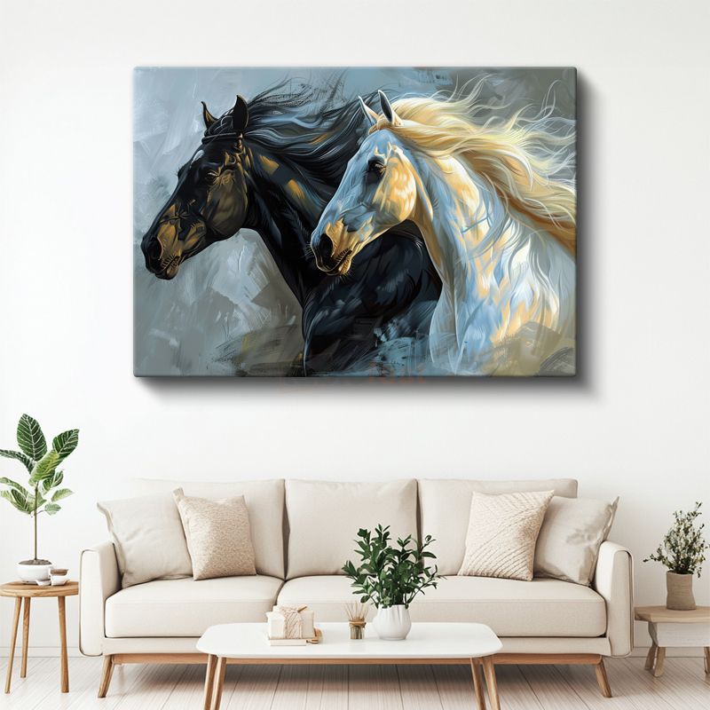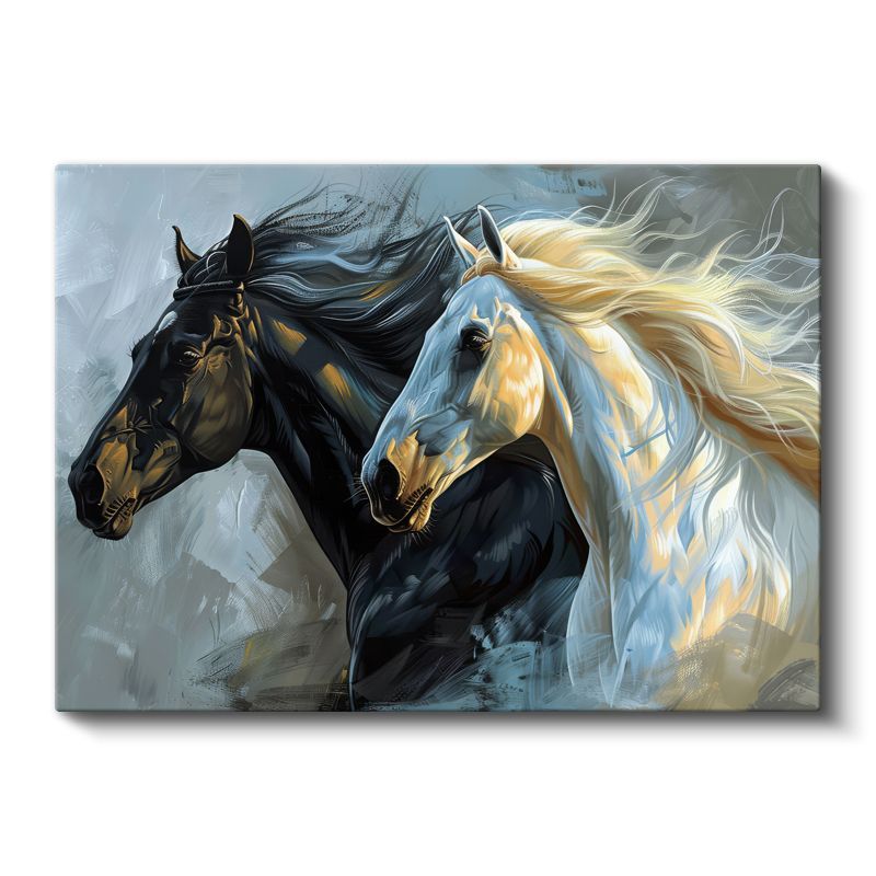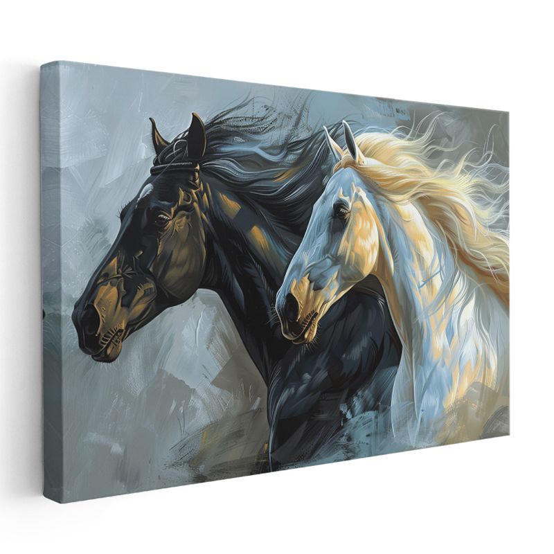 İkili Portre - Siyah ve Beyaz At Başları Kanvas Tablo
