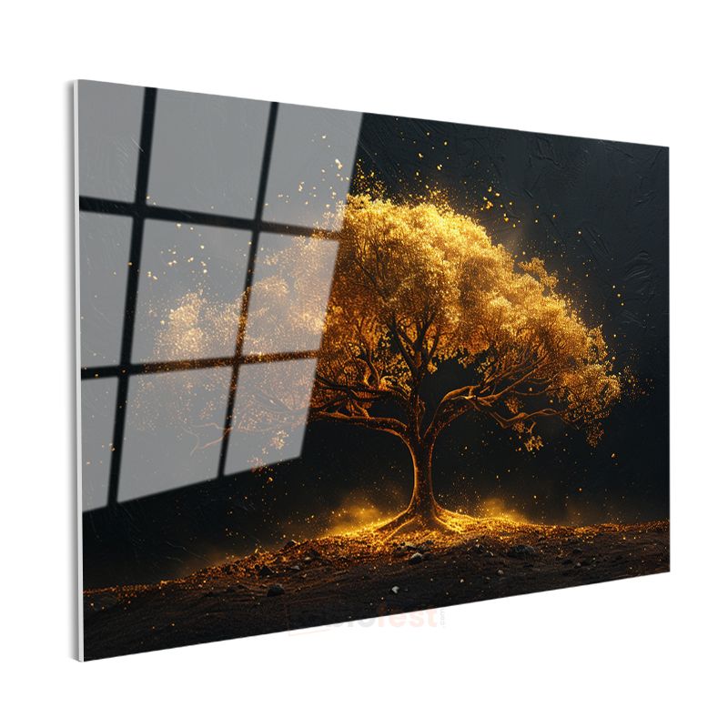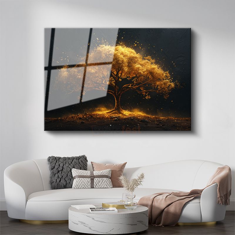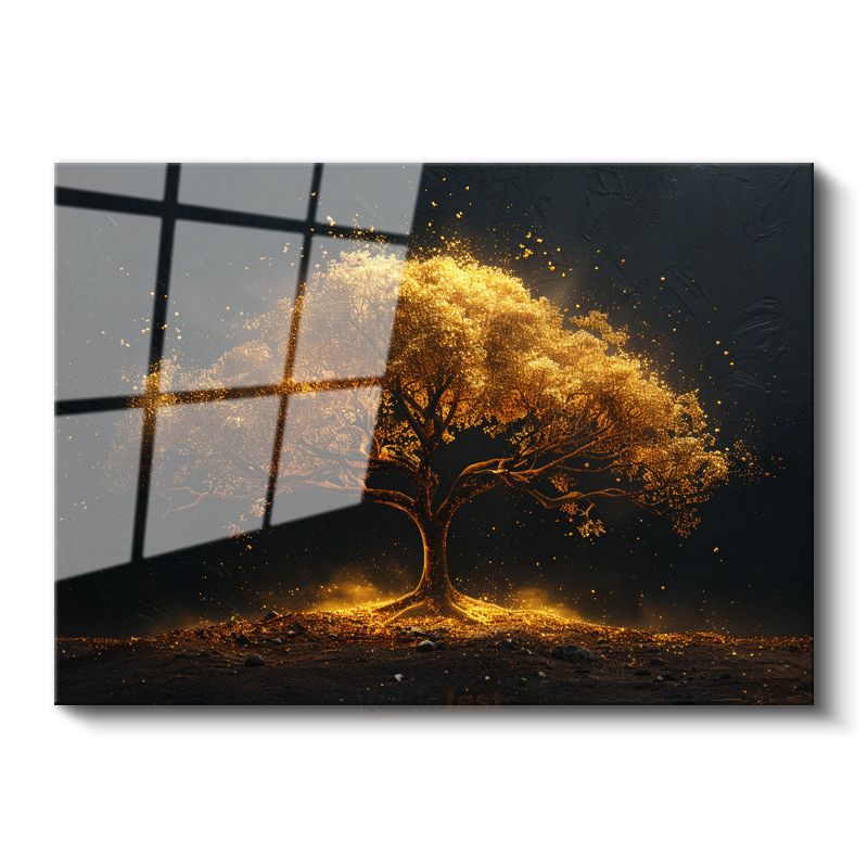 Işıklı Ağaç - Altın Parıltılı Mistik Görünüm Cam Tablo