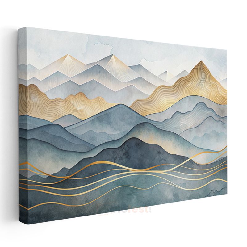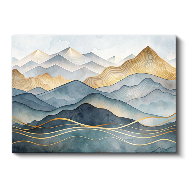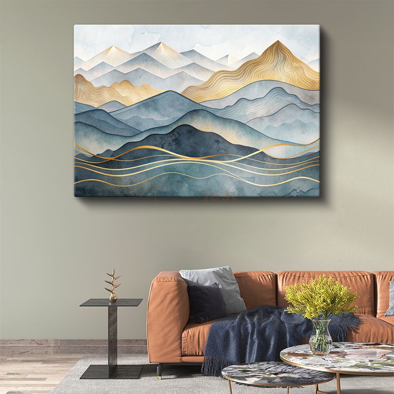Işıklı Tepeler - Altın Çizgili Mavi Dağlar Kanvas Tablo