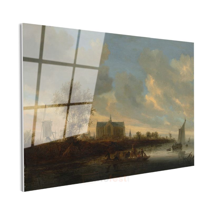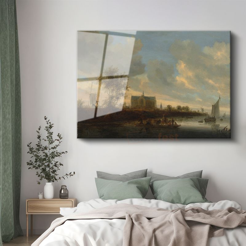 Jan van Goyen - Nehir Kıyısında Kilise Manzarası Cam Tablo