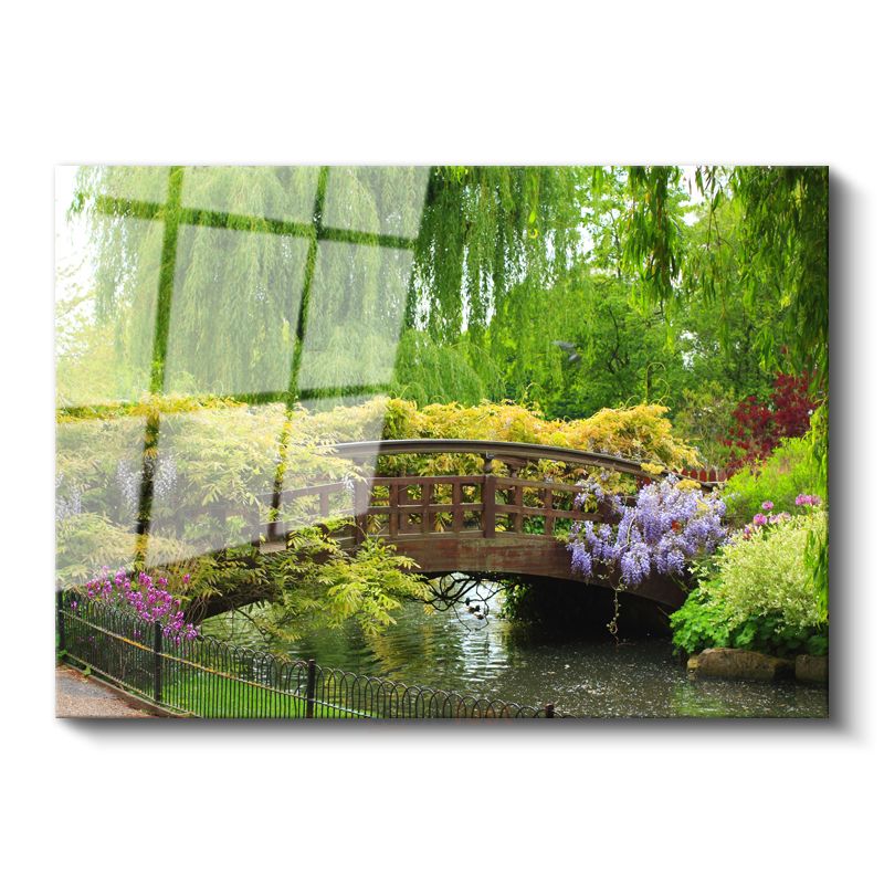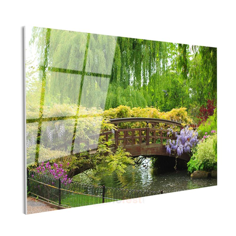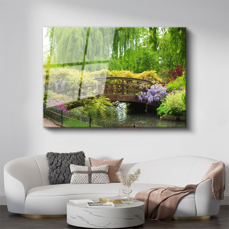 Japon Bahçesi - Söğüt Ağaçlı Köprü Manzarası Cam Tablo