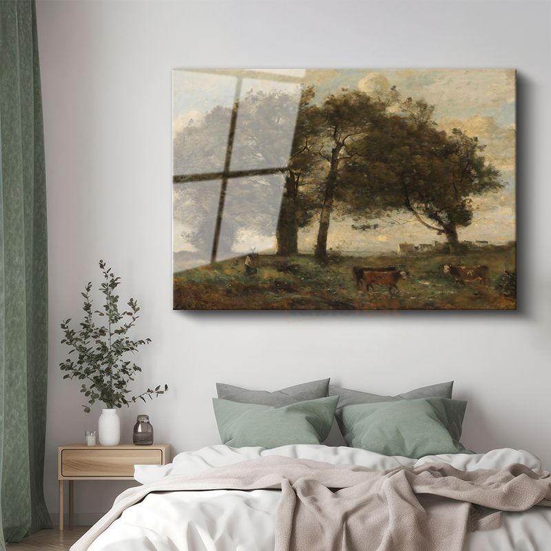 Jean-Baptiste-Camille Corot - Ağaçlar ve Çoban Cam Tablo