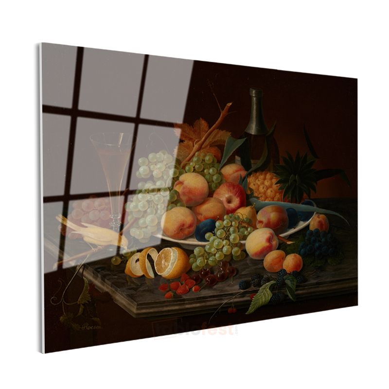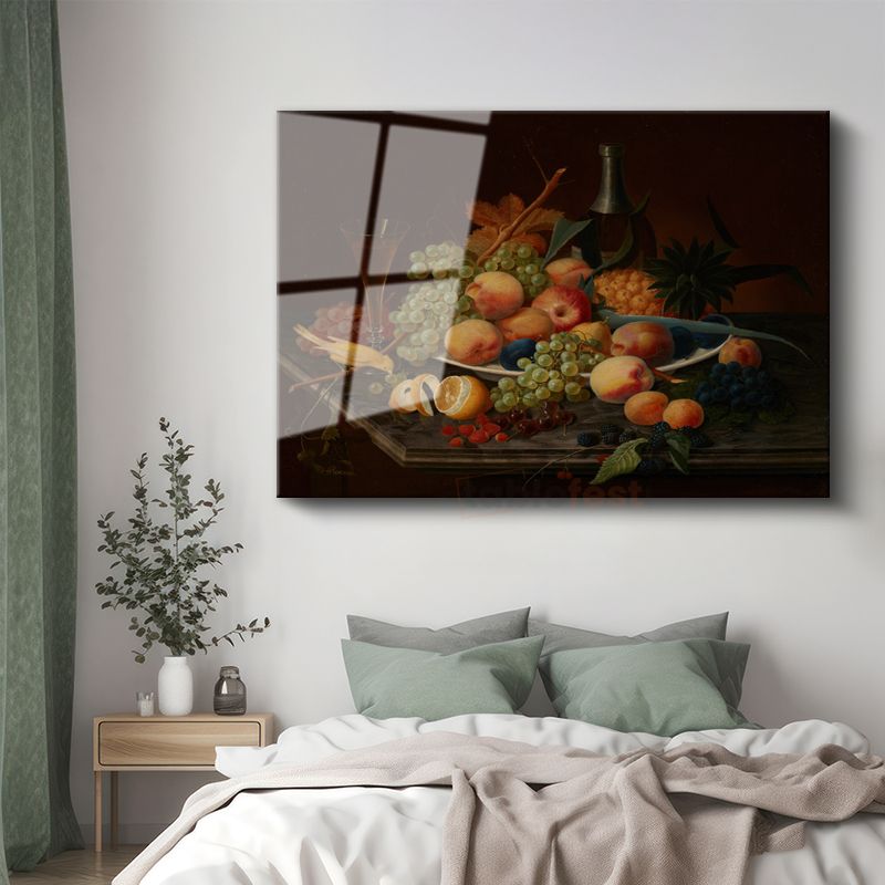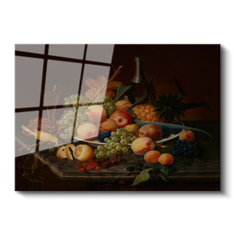 Johann Wilhelm Preyer - Şeftali ve Üzüm Natürmortu Cam Tablo