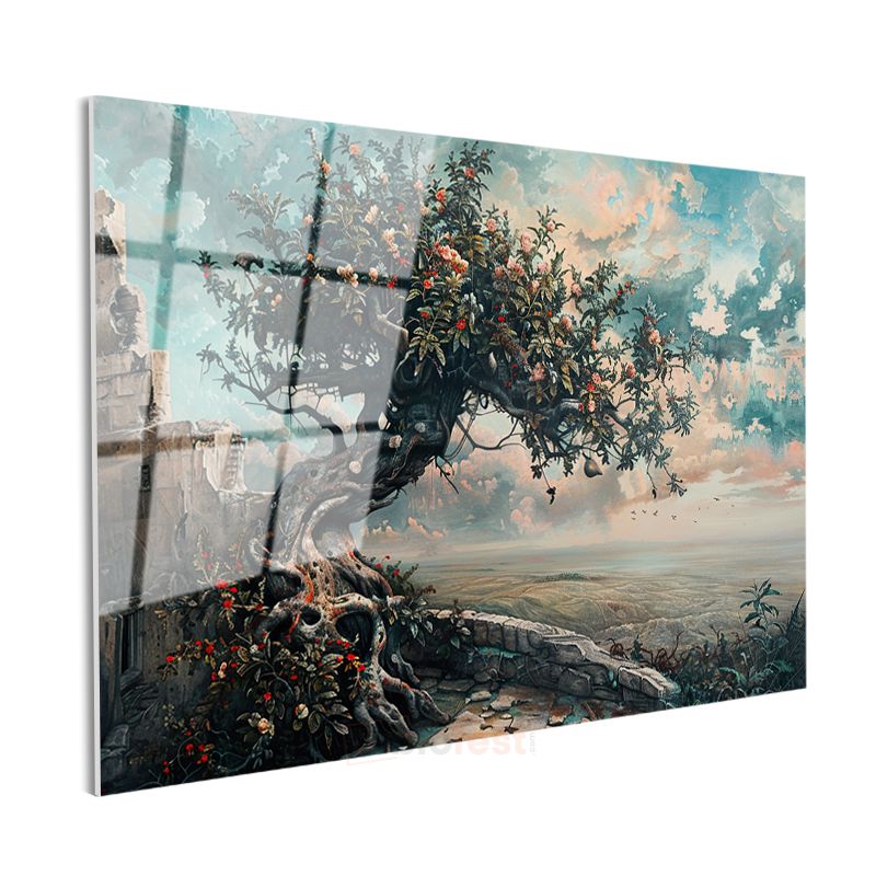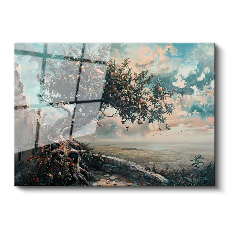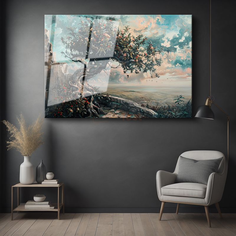 Kadim Zeytin Ağacı - Meyveleriyle Dolu Dal ve Uçsuz Bucaksız Ova Cam Tablo