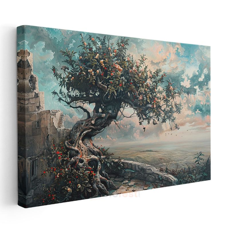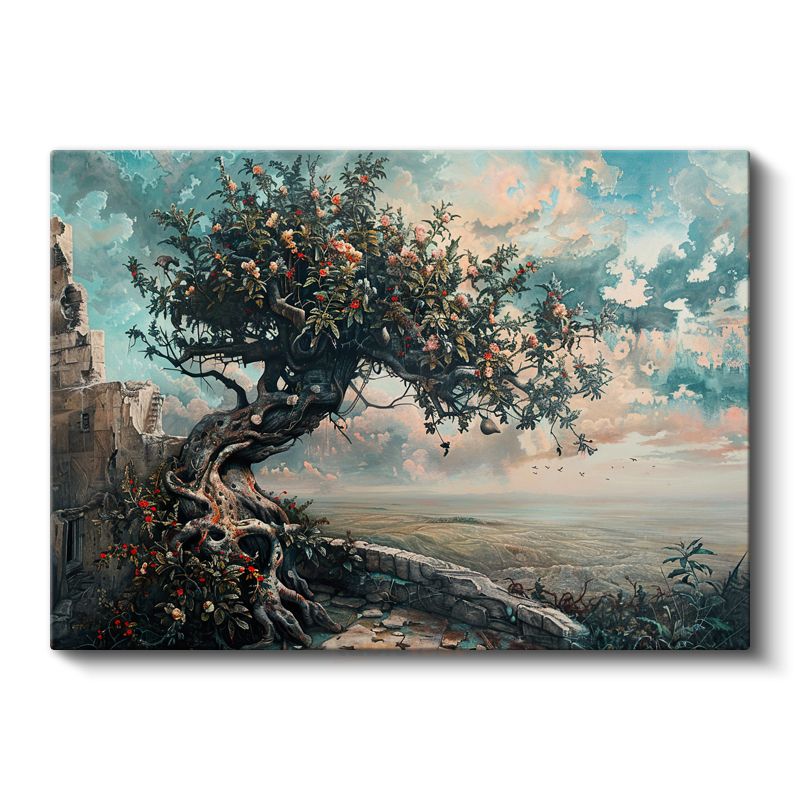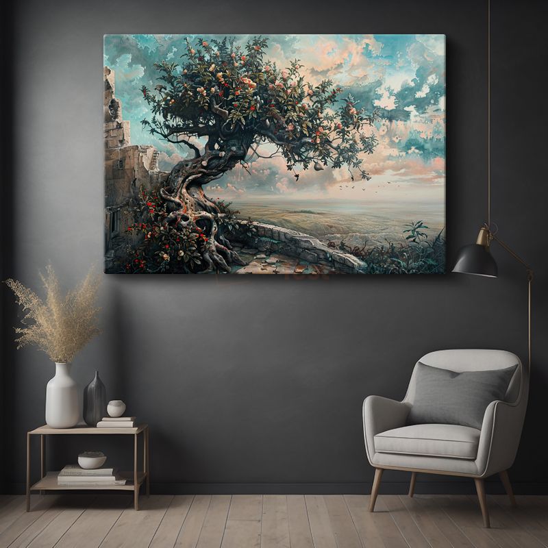 Kadim Zeytin Ağacı - Meyveleriyle Dolu Dal ve Uçsuz Bucaksız Ova Kanvas Tablo