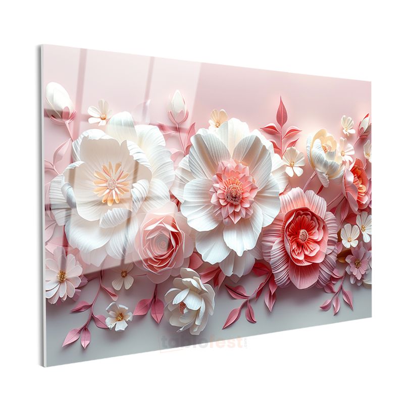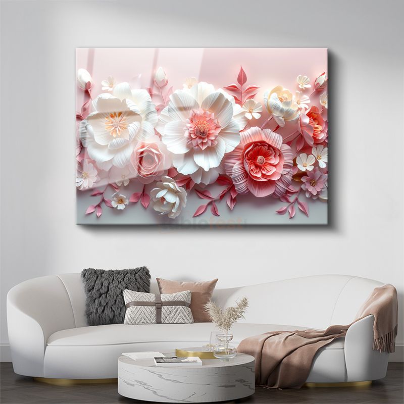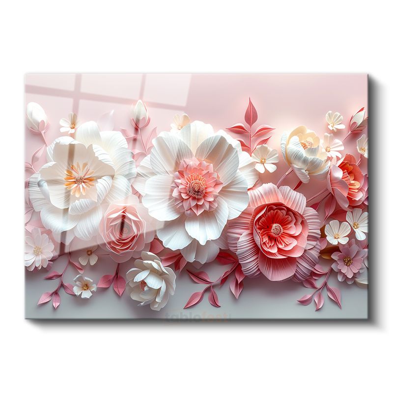 Kağıt Çiçekler - Pembe Beyaz Dekoratif Cam Tablo