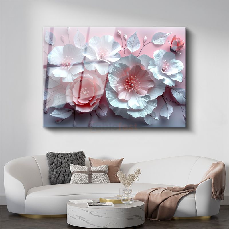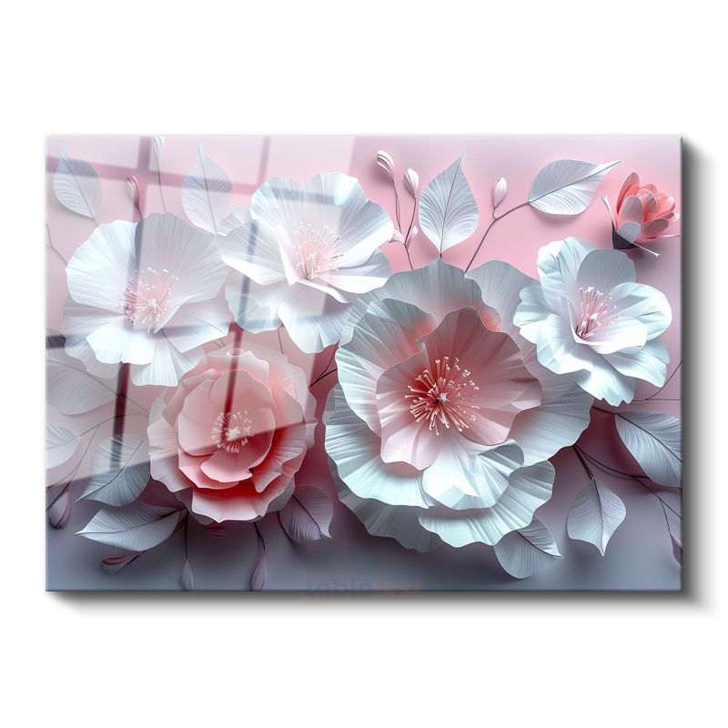 Kağıt Çiçekler - Pembe Fonda Beyaz 3D Kompozisyon Cam Tablo