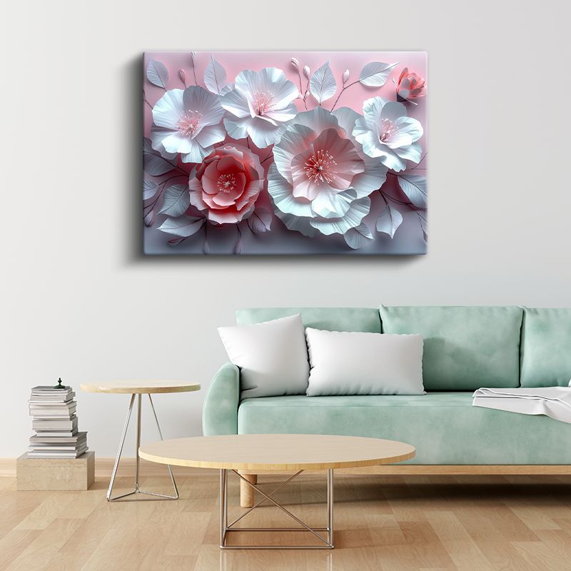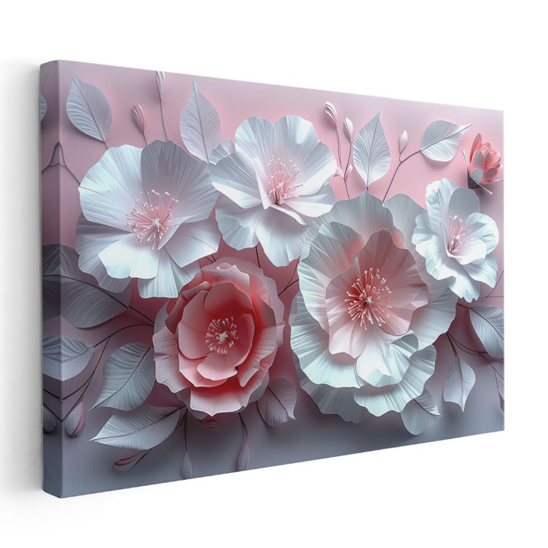 Kağıt Çiçekler - Pembe Fonda Beyaz 3D Kompozisyon Kanvas Tablo