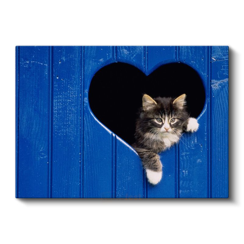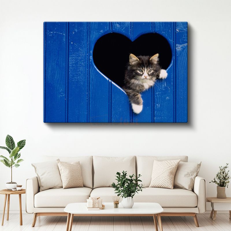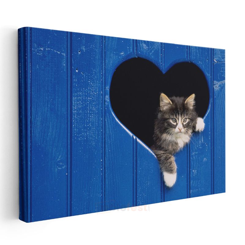 Kalpli Kapı - Mavi Ahşaptan Bakan Yavru Kedi Kanvas Tablo