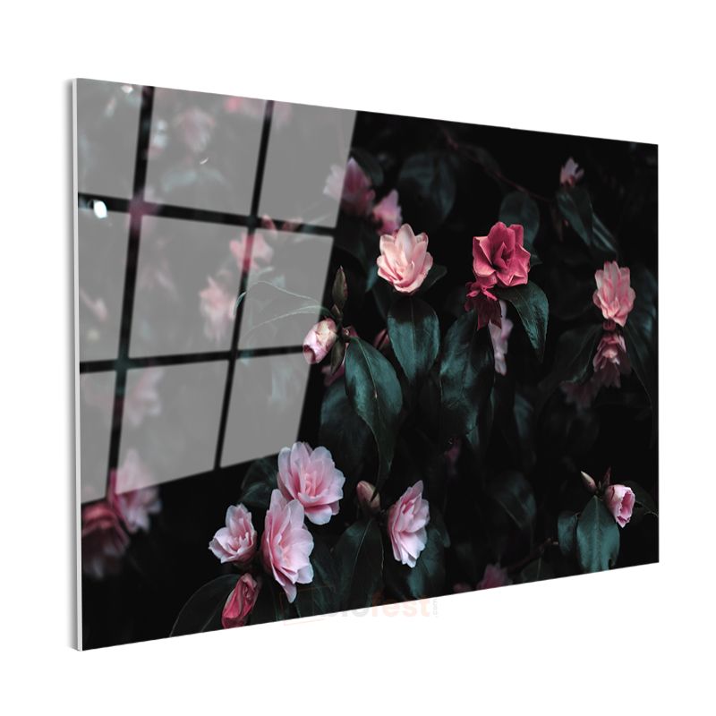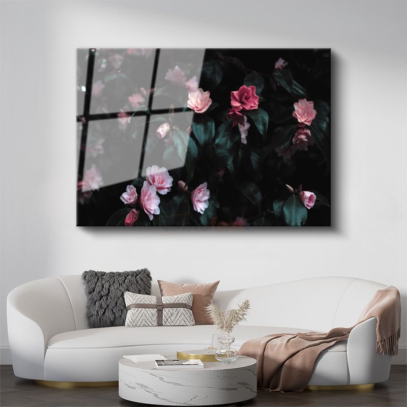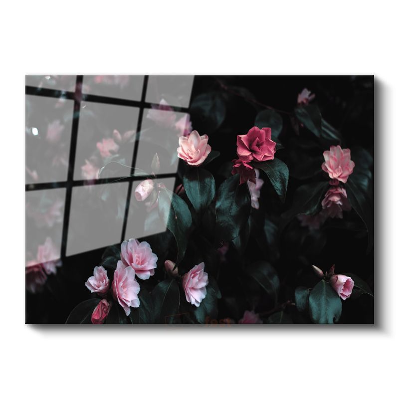Kamelya Çiçekleri - Koyu Yapraklı Romantik Tasarım Cam Tablo