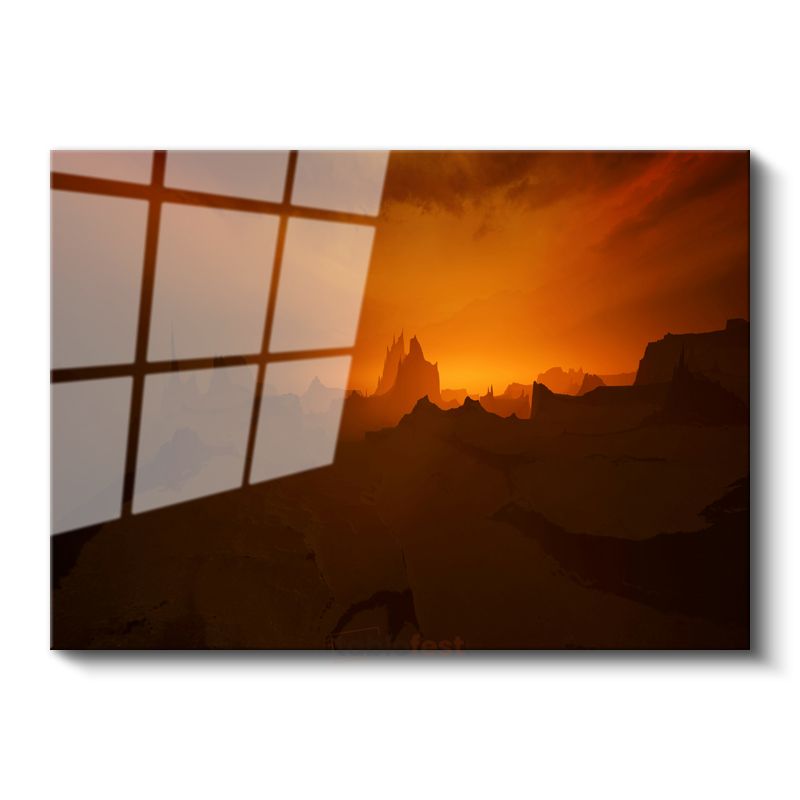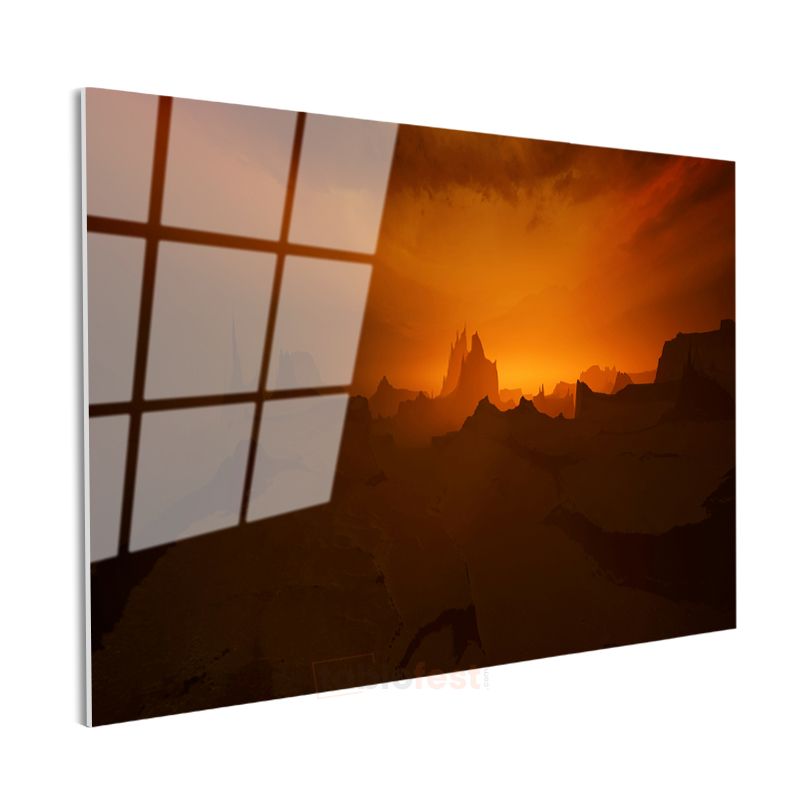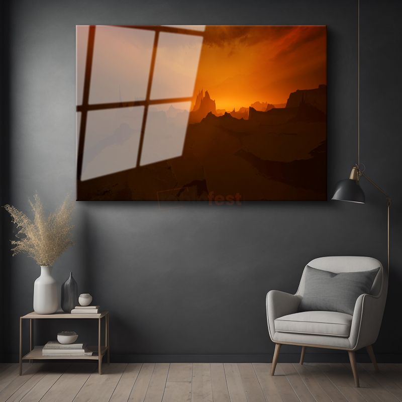 Kanyon Silüeti - Turuncu Gün Batımında Yükselen Kayalıklar Cam Tablo