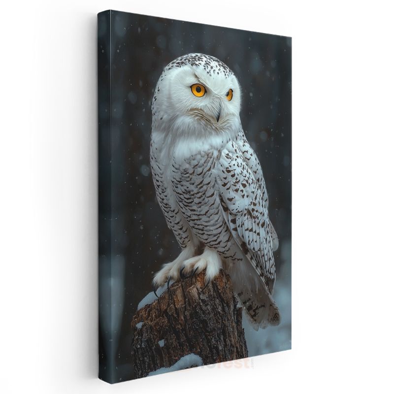 Kar Baykuşu - Kütük Üzerinde Turuncu Gözlü Avcı Kanvas Tablo