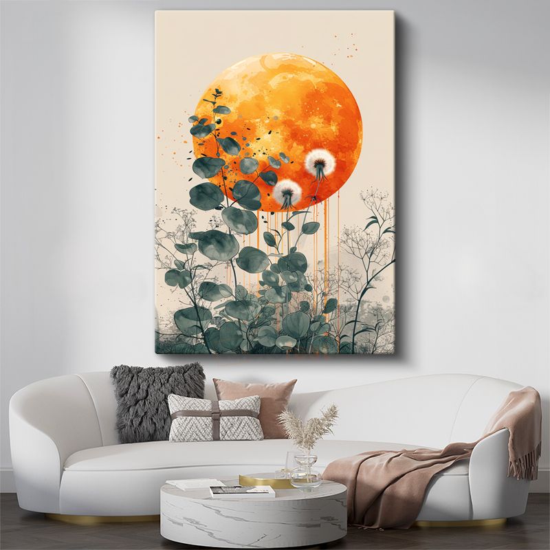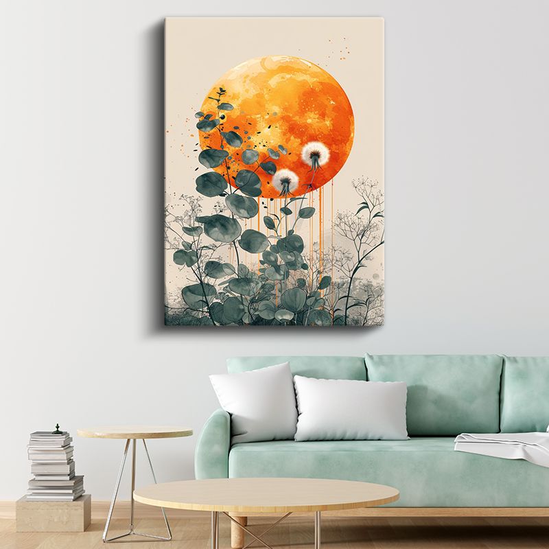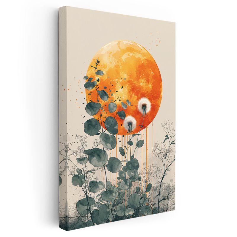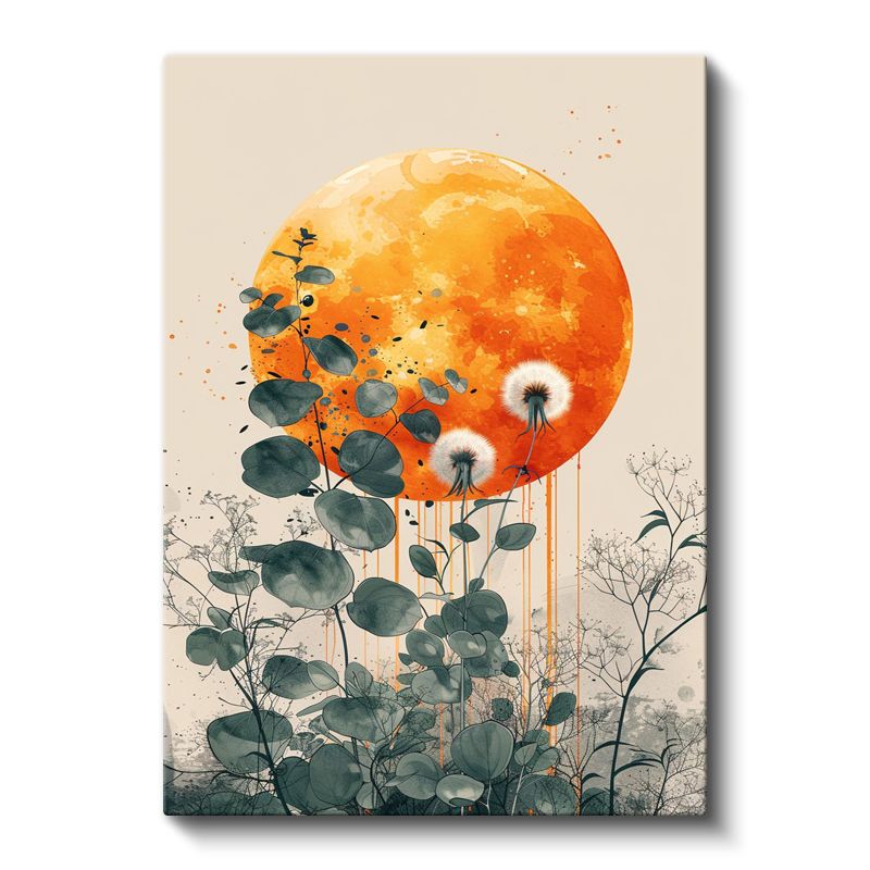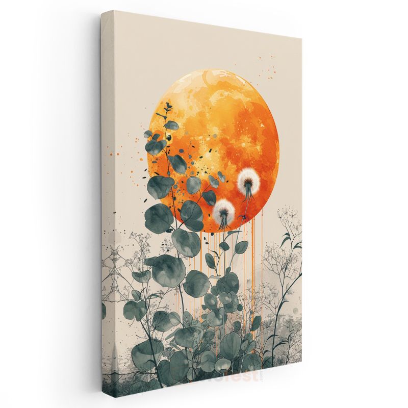 Karahindiba ve Ay - Turuncu Dolunay Fonlu Botanik Kanvas Tablo