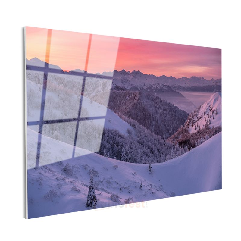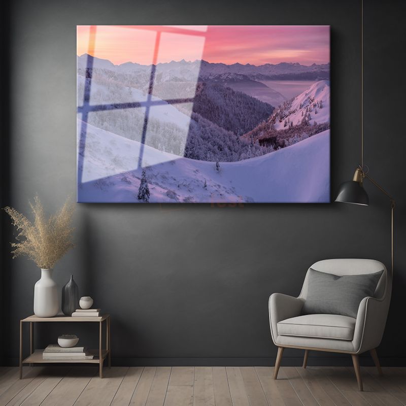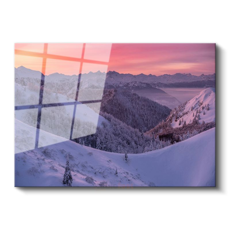 Karlı Dağlar - Pembe Gökyüzü Altında Kış Manzarası Cam Tablo