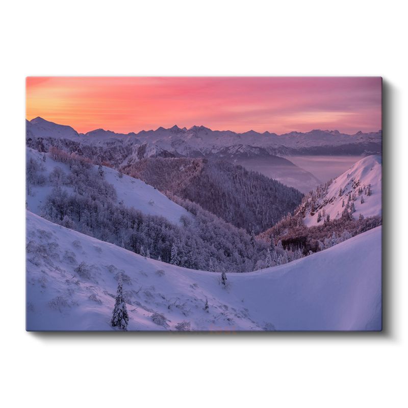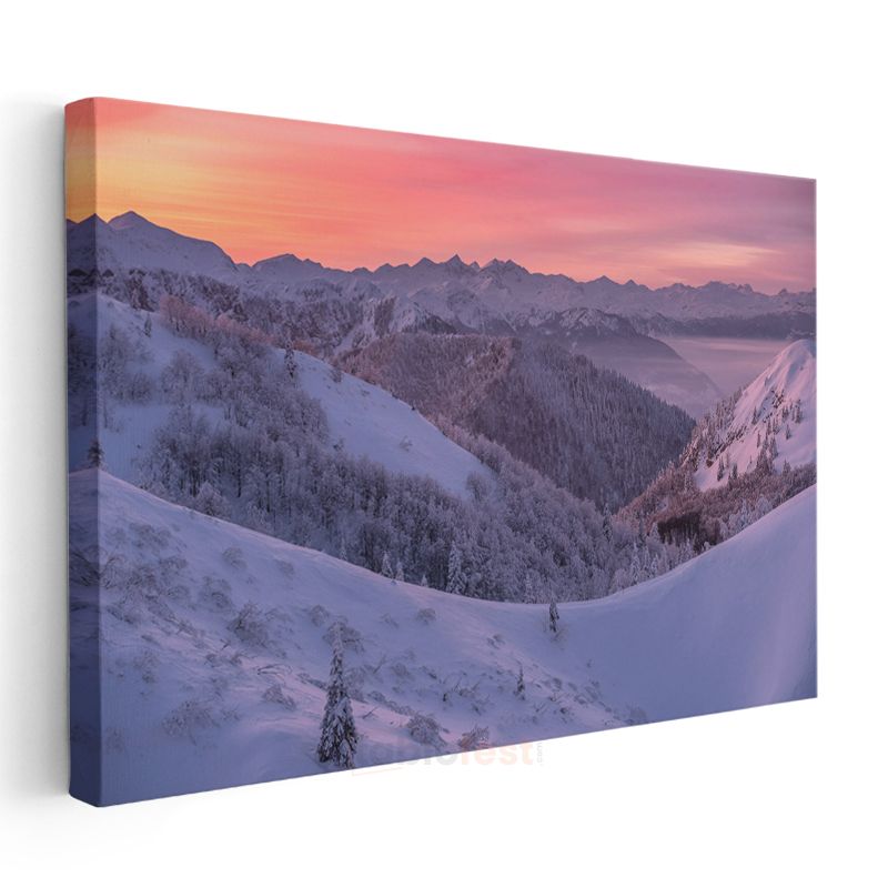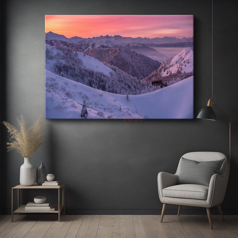 Karlı Dağlar - Pembe Gökyüzü Altında Kış Manzarası Kanvas Tablo