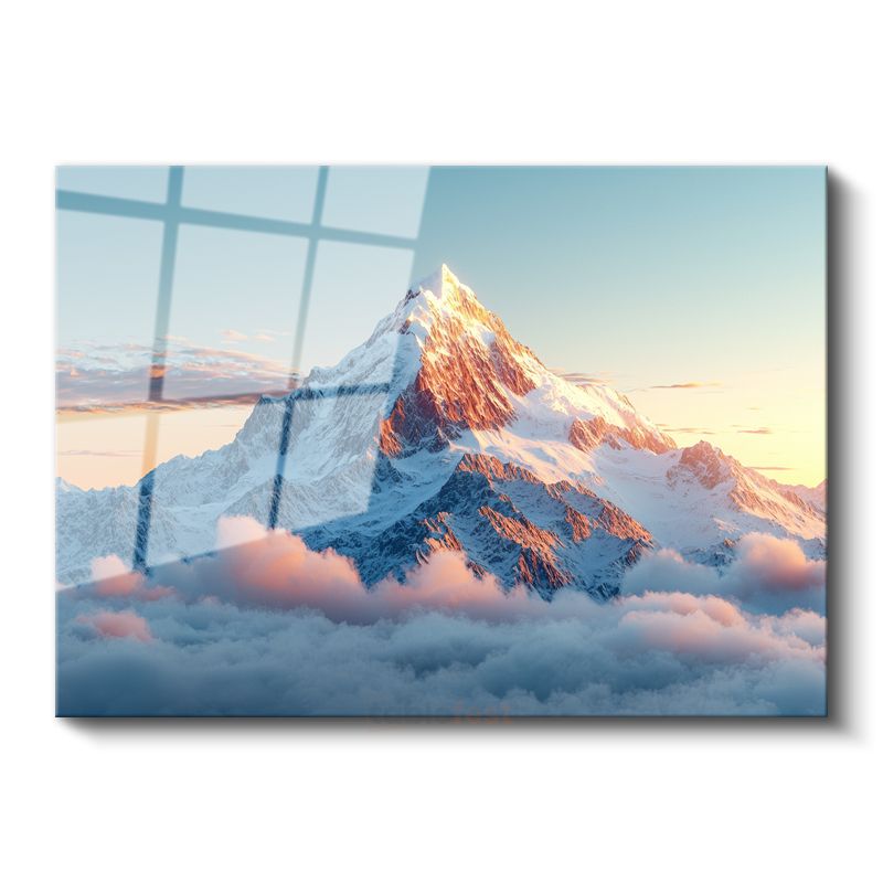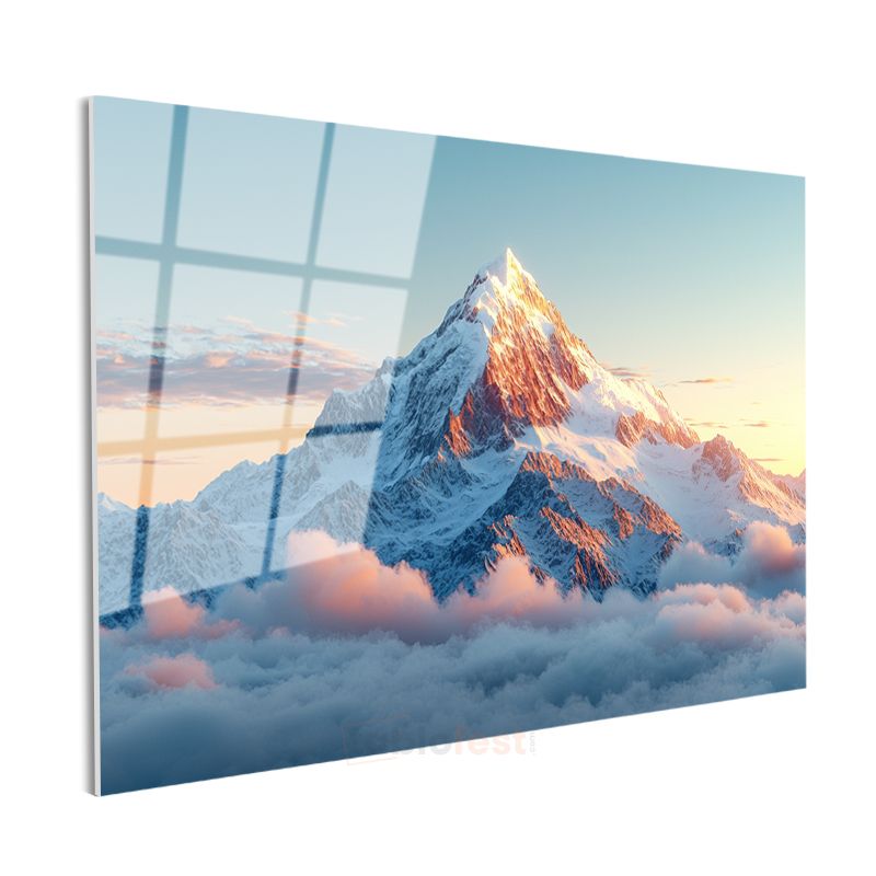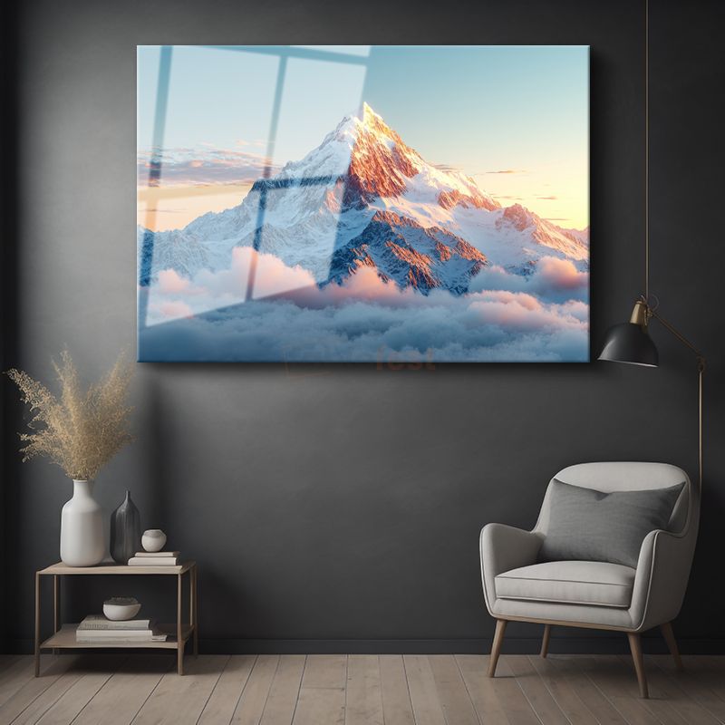 Karlı Zirve - Bulutların Üzerinde Yükselen Dağ Manzarası Cam Tablo