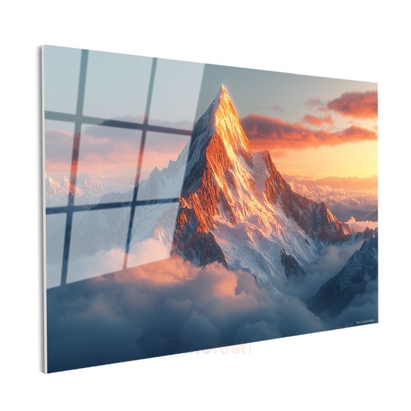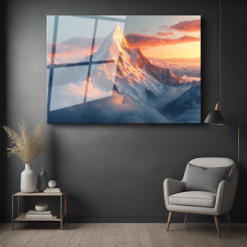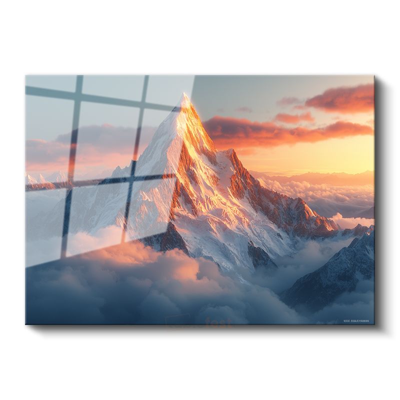 Karlı Zirve - Gün Batımında Işıldayan Dağ Manzarası Cam Tablo