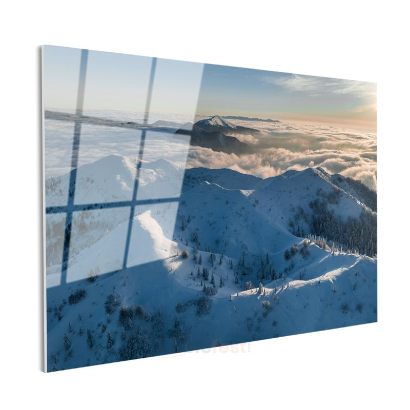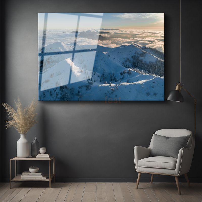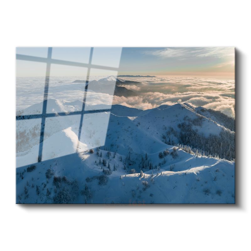Karlı Zirveler - Bulutların Üzerinde Yükselen Dağlar Cam Tablo