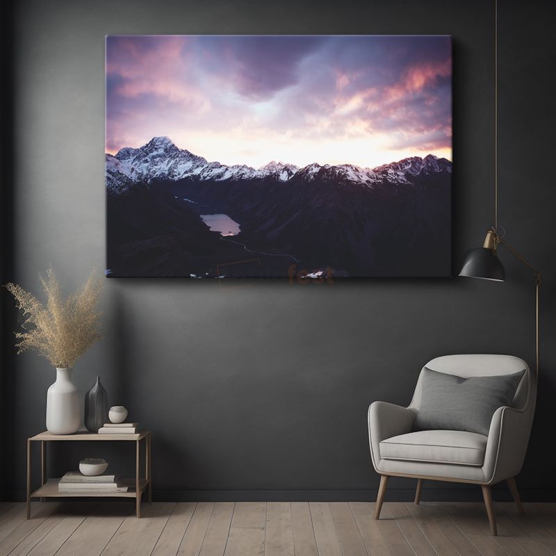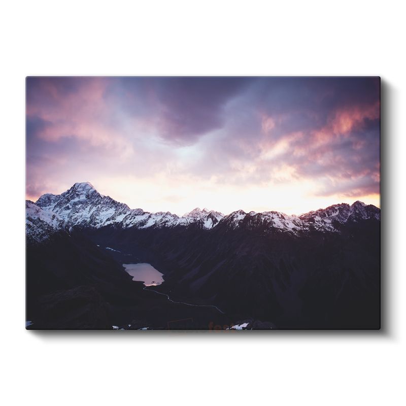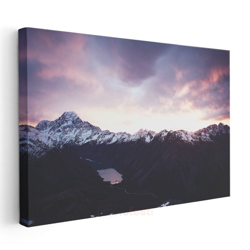 Karlı Zirveler - Gün Batımında Göl Manzaralı Dağ Sırası Kanvas Tablo