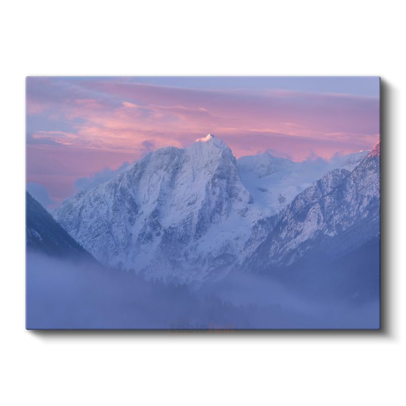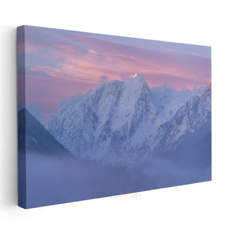 Karlı Zirveler - Gün Doğumunda Pembe Gökyüzü Altında Yükselen Dağlar Kanvas Tablo