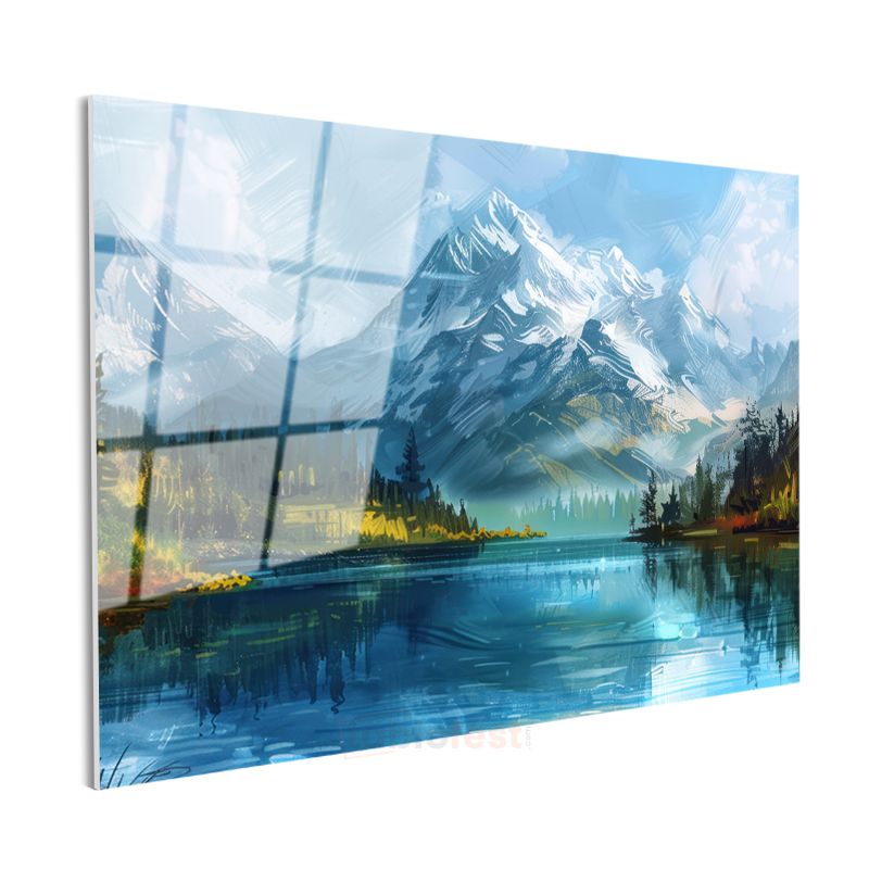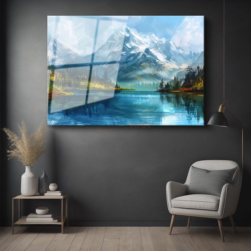 Karlı Zirveler - Masmavi Göl Yansıması Cam Tablo