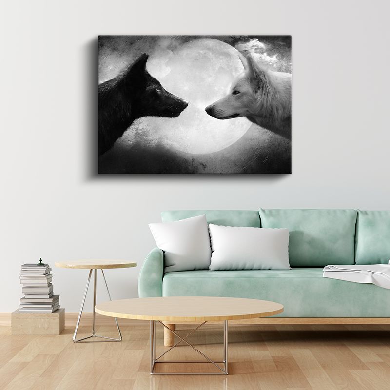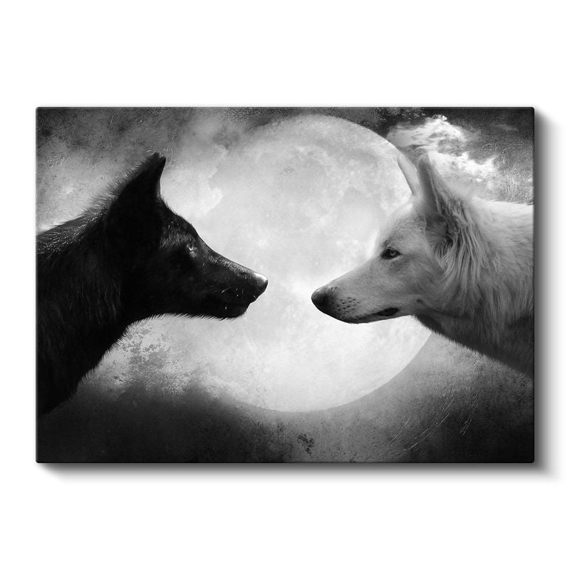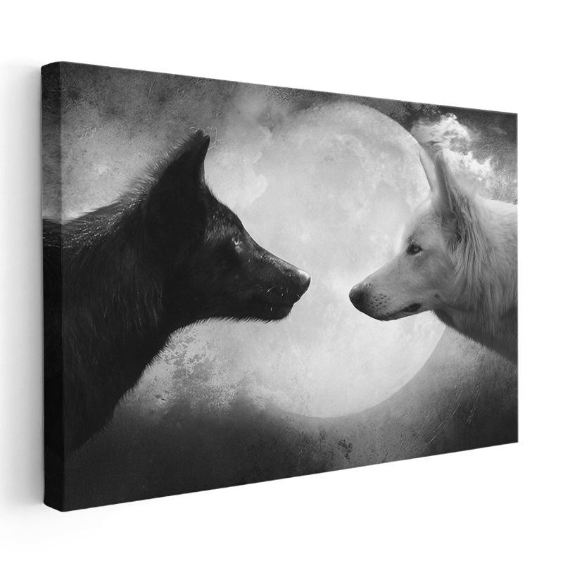 Karşılaşma - Ay Işığında Siyah ve Beyaz Kurt Portresi Kanvas Tablo