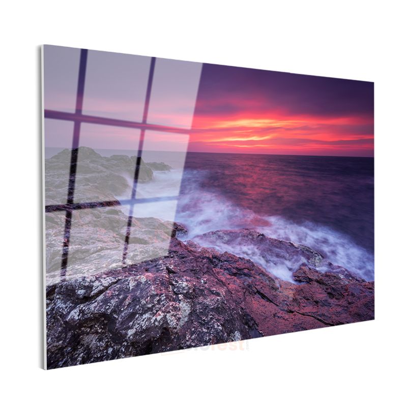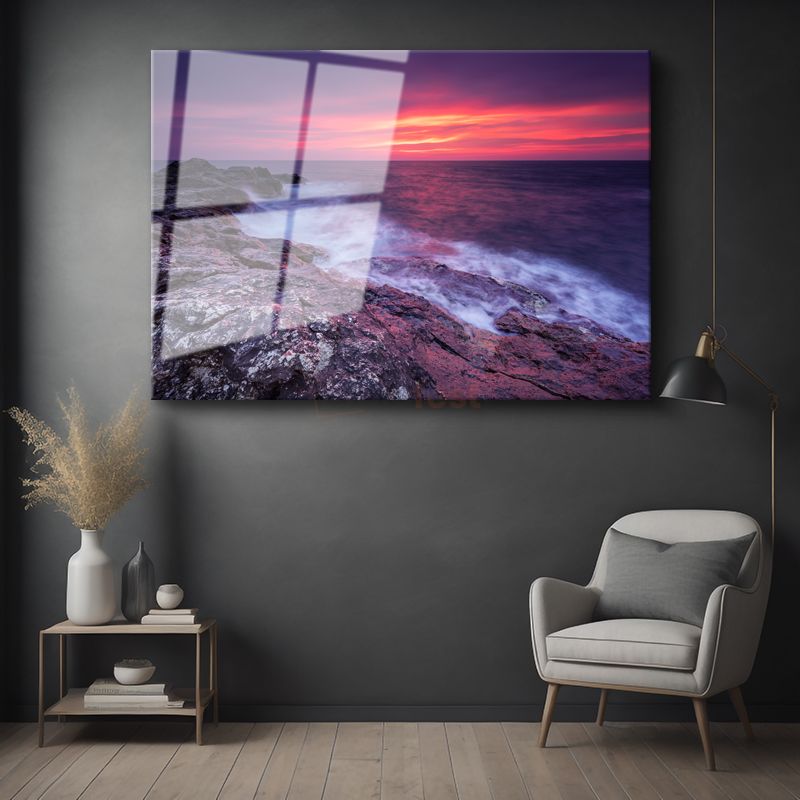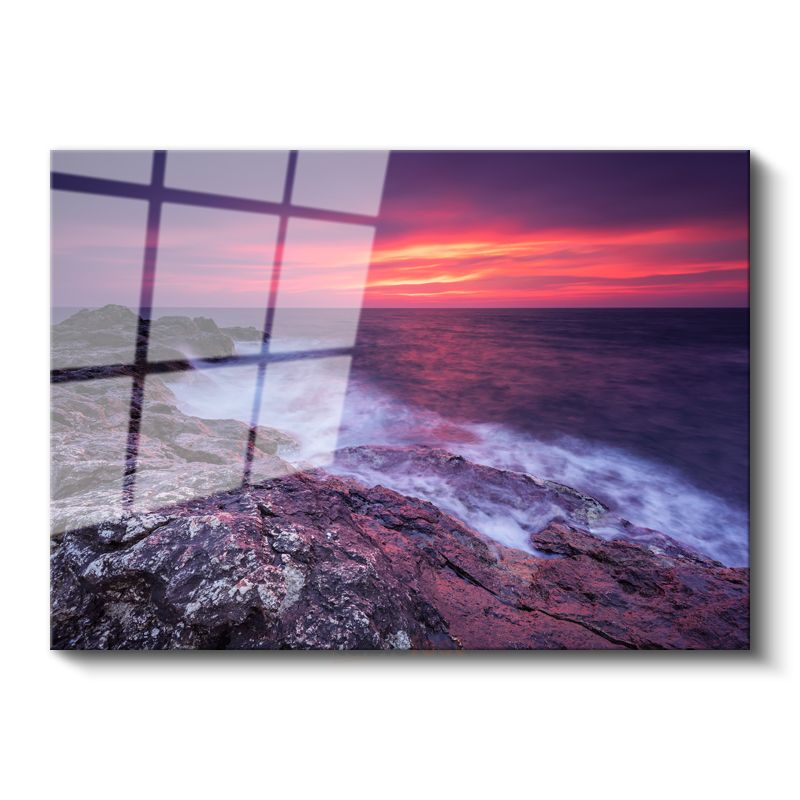 Kayalık Sahil - Mor Tonlarında Büyüleyici Gün Batımı Cam Tablo