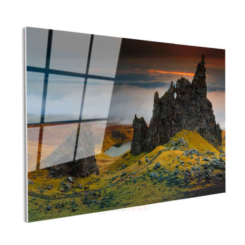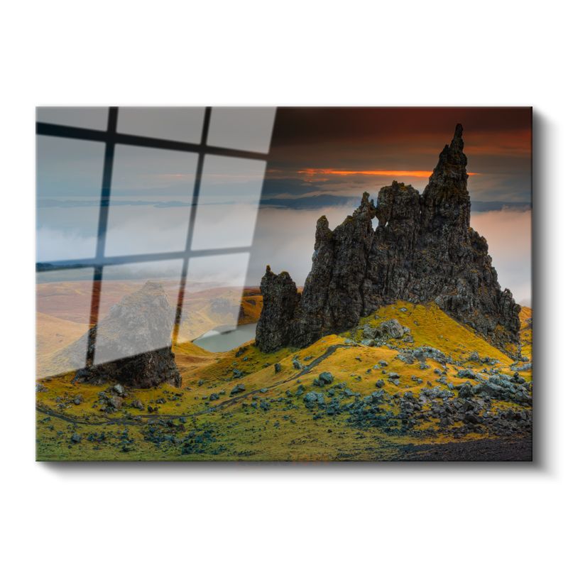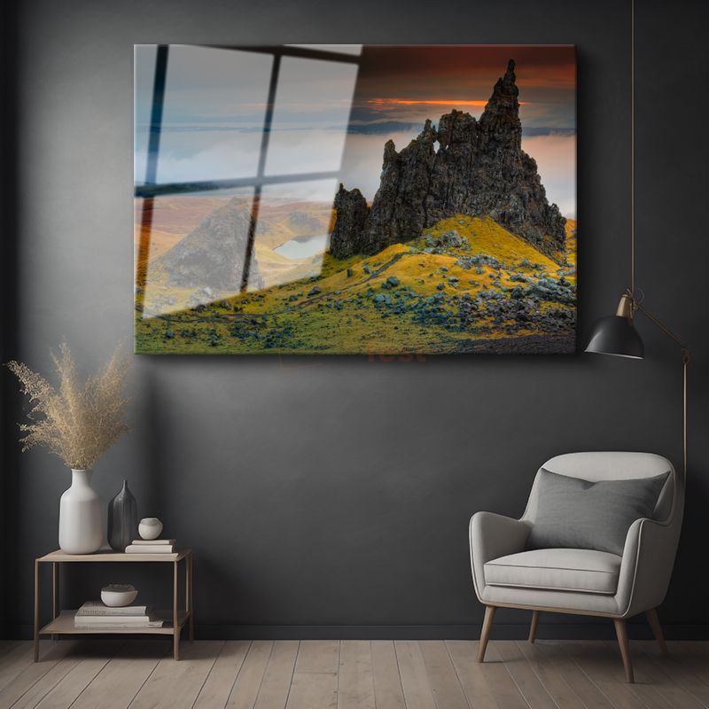 Kayalık Zirveler - Altın Sarısı Otlaklarla Kaplı Tepeler Cam Tablo