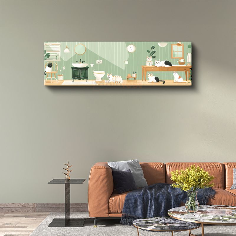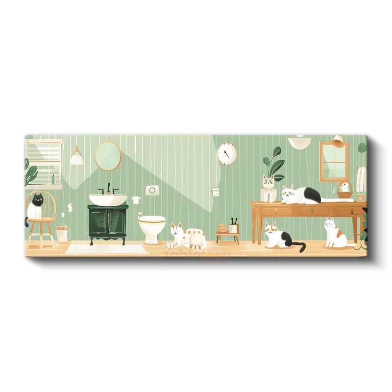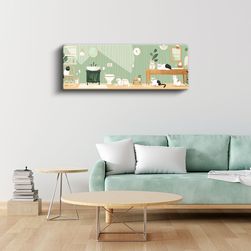 Kedi Dostları - Yeşil Banyo Temalı Vektörel İllüstrasyon Kanvas Tablo