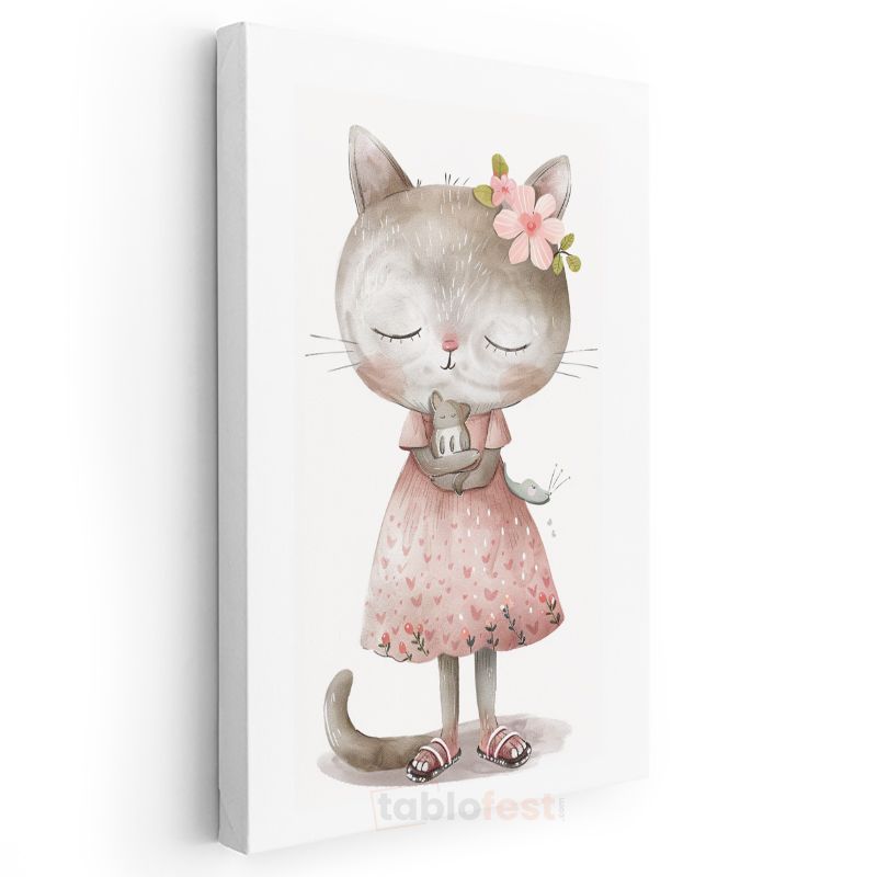 Kedi ve Fare - Pembe Elbiseli Sevimli Dostlar Kanvas Tablo